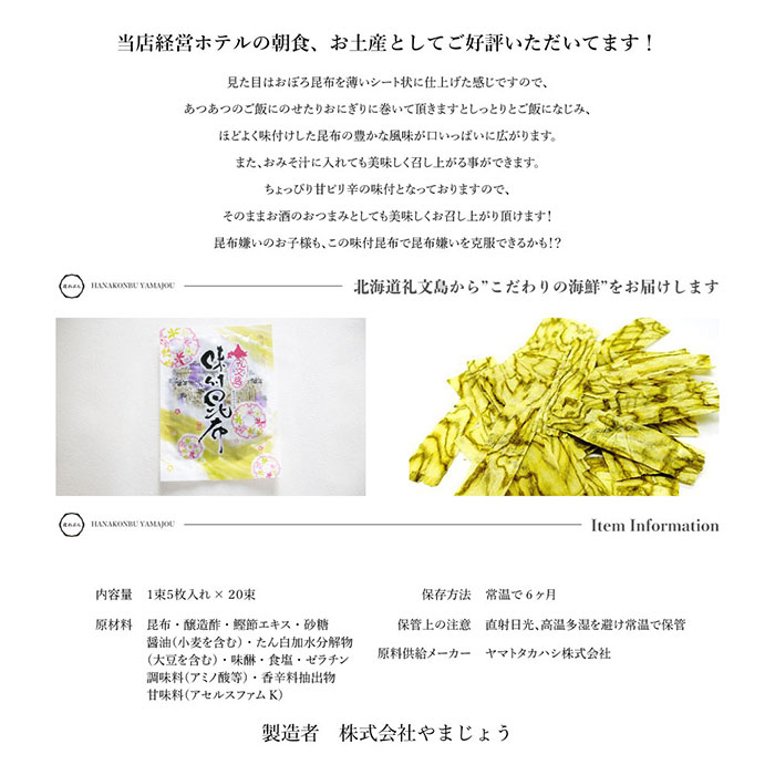 商品詳細名称味付昆布 原材料名 昆布、醸造酢、鰹節エキス、砂糖、醤油(小麦を含む)、たん白加水分解物(大豆を含む)、味醂、食塩、ゼラチン、調味料(アミノ酸等)、香辛料抽出物、甘味料(アセルスファムK) 内容1束5枚入れ×20束 賞味期限 常温保管 6ヶ月 保存方法直射日光、高温多湿を避け常温で保管 販売者 株式会社やまじょう北海道礼文郡礼文町香深村字トンナイ558-16 花れぶん内TEL:0163861176 当店経営のホテル内売店でのお土産人気ナンバーワン商品です。Item Information 内容量 1束5枚入れ×20束 原材料 昆布、醸造酢、鰹節エキス、砂糖、醤油(小麦を含む)、たん白加水分解物(大豆を含む)、味醂、食塩、ゼラチン、調味料(アミノ酸等)、香辛料抽出物、甘味料(アセルスファムK) 保存方法 常温で6ヶ月 保管上の注意 直射日光、高温多湿を避け常温で保管 販売者 株式会社やまじょうS48 原料供給メーカー ヤマトタカハシ株式会社