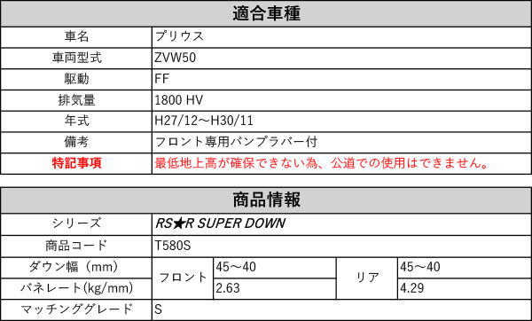 [RS-R_RS★R SUPER DOWN]ZVW50 プリウス_S(2WD_1800 HV_H27/12〜H30/11)用競技専用ダウンサス[T580S]