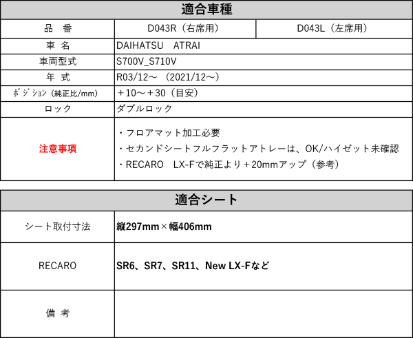 【適合や納期を必ずご確認ください。】 ■カワイ製作所製シートレール ◇対 応 車 種 表 品 番:D043R(右席用) / D043L(左席用) 車 名:DAIHATSU ATRAI 型 式:S700V_S710V 年 式:R03/12〜 ポジション:+10〜+30(目安) ロック:ダブルロック 備 考: ・フロアマット加工必要 ・セカンドシートフルフラットアトレーは、OK/ハイゼット未確認 ・RECARO LX-Fで純正より+20mmアップ(参考) シート取付寸法 ■縦297mm×幅406mm 取付可能シート一例 ・SR6、SR7、SR11、新LX-Fなど (SR2/3/4/5、旧LX除く)【必ずご確認ください】 [レカロSR6/SR7/SR11/LX-F]S700V_S710V アトレー(R03/12−)用シートレール[保安基準適合][カワイ製作所製] カワイ製作所 カワイワークス 車検 対応 RECARO