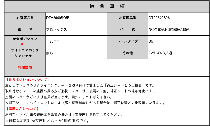 【対 応 車 種】 右席品番:DTA2640B06R 左席品番:DTA2640B06L 車 名:プロボックス 型 式:NCP160V,NSP160V,165V ポジション:-20mm レールタイプ:B6 サイドSRS:無し 備 考:----- 【適合シート】 ・SRシリーズ ・Lシリーズ ・LX-F(LX後継モデル) ・ERGOMEDシリーズ ・現行ORTHOPADシリーズ車検 RECARO BRIDE sparco COBRA OMP レカロ ブリッド スパルコ コブラ 汎用 流用 適合 対応 自作 ボルト