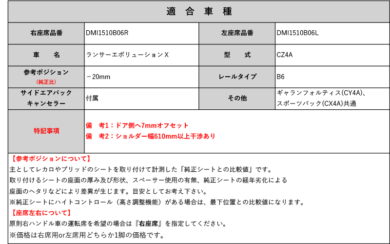 【対 応 車 種】 右席品番:DMI1510B06R 左席品番:DMI1510B06L 車 名:ランエボ10 型 式:CZ4A ポジション:−20mm レールタイプ:B6 サイドSRS:付属 備 考1:ドア側へ7mmオフセット 備 考2:ショルダー幅610mm以上干渉あり 備 考3:ギャランフォルティス(CY4A)、スポーツバック(CX4A)共通 【適合シート】 ・SRシリーズ ・Lシリーズ ・LX-F(LX後継モデル) ・ERGOMEDシリーズ ・現行ORTHOPADシリーズ車検 RECARO BRIDE sparco COBRA OMP レカロ ブリッド スパルコ コブラ 汎用 流用 適合 対応 自作 ボルト