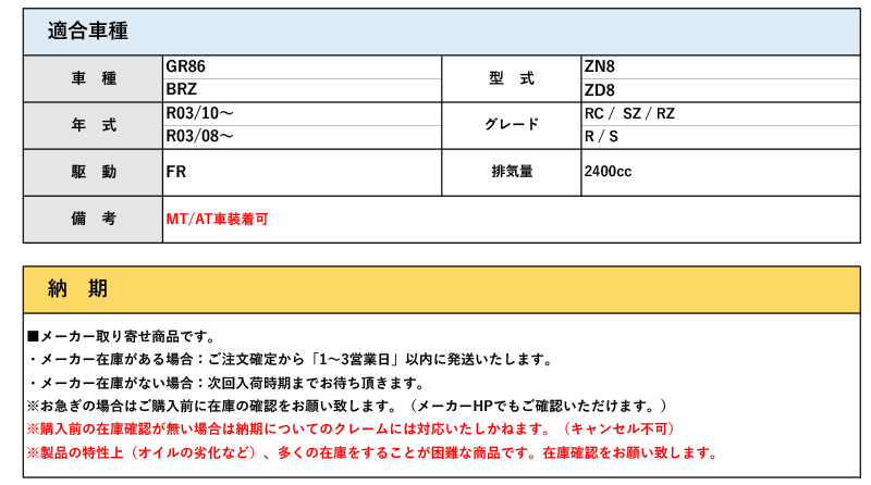 【適合車種】 [車 種]BRZ [型 式]ZD8 [年 式]R03/08〜 [駆動・排気量]FR / 2400cc [備 考]----- 【製品詳細】 [品 番]965 029 DC リヤデフドライブピニオンギヤのプリロード調整に使用されている、 純正部品の「つぶしタイプカラー」を、本製品の「シム調整タイプカラー」に 交換することで、高負荷走行によるバックラッシュの増加を抑え、 ディファレンシャルギヤや周辺部品の破損を防ぎます。 ※本製品の取付時にはプリロード調整シムとして、別途日産純正部品『ドライブピニオンプリロード調整用アジャストワッシャー』が必要です。 注意事項: 1)商品に使用している画像と現物と違う場合がございます。ご了承ください。 2)予告なく価格変更、販売中止になる場合がございます。キャロッセ クスコ 車検 メーカー おすすめ 剛性 スタビ ドリフト