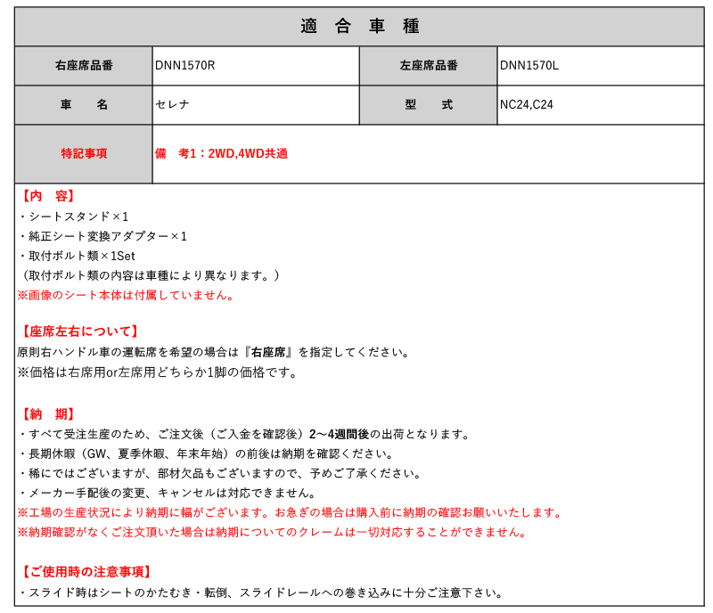 【対 応 車 種】 右席品番:NPA004+NPA100(DNN1570R) 左席品番:NPA004+NPA101(DNN1570L) 車 名:セレナ 型 式:NC24,C24 備 考1:2WD,4WD共通 【内 容】 ・シートスタンド×1 ・純正シート変換アダプター×1 ・取付ボルト類×1Set (取付ボルト類の内容は車種により異なります。) 【商品説明】 シート交換後の純正シートを再利用! お店のディスプレイやご家庭で使用可能にするシートスタンド。 底面にセットしたゴムが、スベリや(床の)キズをある程度緩和しますが、 フローリングに置かれる際はマットレスなどをひくか、キャスター付きがおすすめです。 ※価格は1脚分の価格です。 ※商品画像のシート本体は付属していません。車検 RECARO BRIDE sparco COBRA OMP レカロ ブリッド スパルコ コブラ 汎用 流用 適合 対応 自作 ボルト