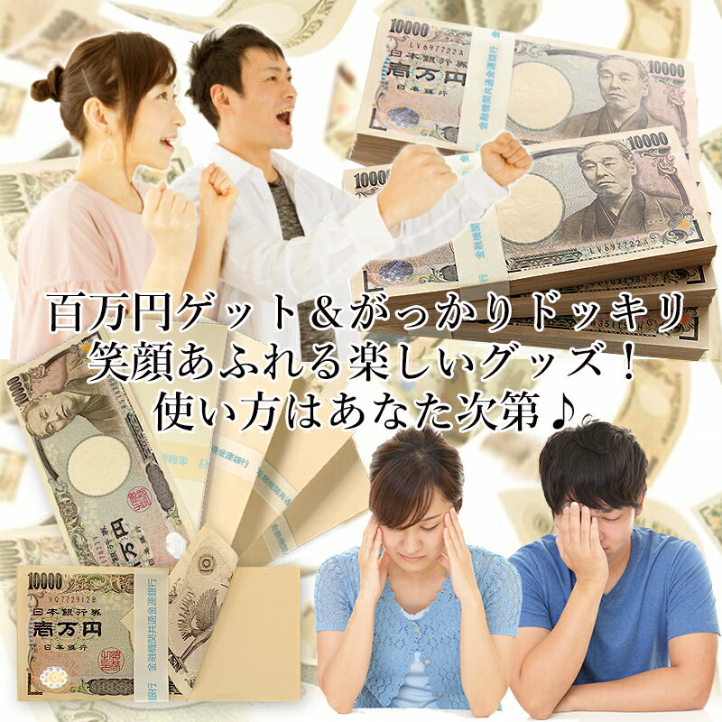 商品詳細 名称 1万円de百万円メモ 原材料 紙・フィルム外包 内容量 約100g 保存方法 直射日光や湿度の高い場所はお避け下さい。 原産国 日本 使用方法 本商品の無地メモ帳に本物の一万円を挟んでご使用ください。あまりにもリアルな為、ご使用の際は自己責任でお願いいたします。あくまでもドッキリ玩具ですので、楽しんでご使用くださいませ。 発送方法 9束まではメール便・10束以上は宅急便商品詳細 名称 1万円de百万円メモ 原材料 紙・フィルム外包 内容量 約100g 保存方法 直射日光や湿度の高い場所はお避け下さい。 原産国 日本 使用方法 本商品の無地メモ帳に本物の一万円を挟んでご使用ください。あまりにもリアルな為、ご使用の際は自己責任でお願いいたします。あくまでもドッキリ玩具ですので、楽しんでご使用くださいませ。 発送方法 9冊まではメール便・10札以上は宅急便 まとめ買いがとってもお得です! 1束 2束 3束 5束 10束 20束 50束 100束