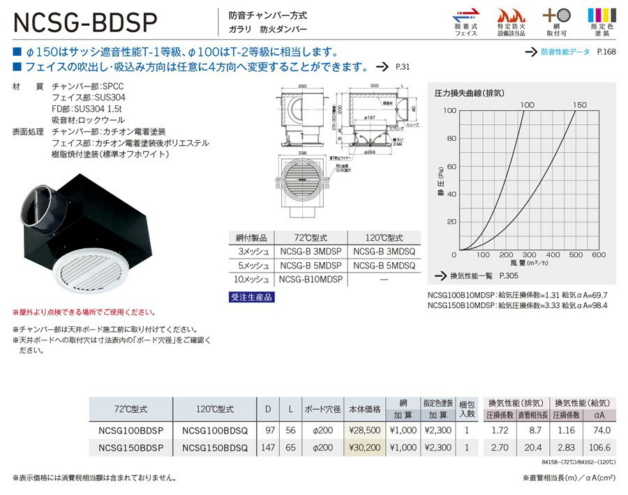 材質:チャンバー部:SPCCフェイス部:SUS304FD部:SUS304 1.5t吸音材:ロックウール表面処理:チャンバー部:カチオン電着塗装フェイス部:カチオン電着塗装後ポリエステル樹脂(標準オフホワイト)製品特長:NCSG-Bについてフェイスの吹出し・吸込み方向は任意に4方向へ変更することができます。NCSG-Bについて防音性能φ150はサッシ遮音性能T-1等級、φ100はT-2等級に相当します。【換気性能】排気 圧損係数:2.7排気 直管相当長:20.4給気 圧損係数:2.83給気 αA:106.6