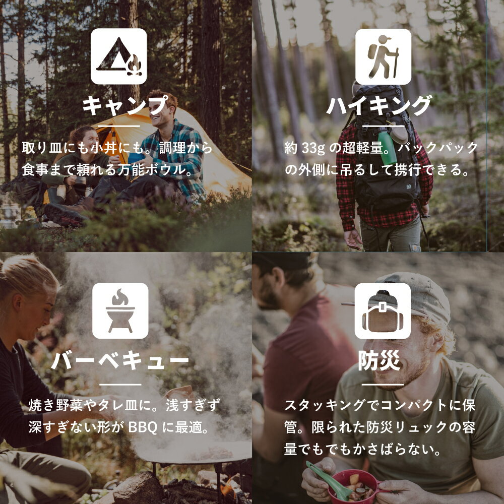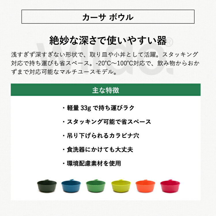ハンドル付きで熱い物から冷たい物まで持ち易く、お皿やどんぶり、コップなど様々な用途で使用可能。350 mlと手のひらに収まるサイズで軽食にぴったりです。 伝統的な北欧スタイルのマグカップからインスピレーションを受けているので、シンプルで頑丈。わずか34gと軽量で、さらに複数個をスタッキング出来るため少ないスペースでも持ち運びが可能です。 ・軽くて丈夫 ・持ち手部分の穴にカラビナなどを装着し吊り下げ可能 ・環境に優しい素材でサステナブル ・複数スタッキングが可能 ・食洗機にかけても大丈夫 ・北欧らしいポップな6カラー 生産国:スウェーデン 使う人数分用意したい、シンプルでコンパクトなボウル 環境にも優しい機能的カトラリー「ウィルドゥ」 「Wild Outdoor」からその名がとられたスウェーデン発のカトラリーブランド「ウィルドゥ」。 軽量かつ機能的、コンパクトなカトラリーはキャンプやトレッキング、普段使いにと幅広く活用でき、北欧の過酷な気候条件でも問題なく機能します。 また環境負荷の軽減にも力を入れており、化石燃料を削減した素材の活用や、製造をスウェーデン国内で行うなど、環境に配慮した持続可能な製品作りを続けています。 ウィルドゥの環境に対する取り組み 通常のカーサ ボウル(カラー:ライム、オリーブ、オレンジ)はBPA(内分泌系への悪影響が懸念されているビスフェノールAという化学物質で、一部のプラスチック素材に含まれる)フリーのポリプロピレン(PP)で作られています。 熱いお湯を入れても有害な成分が溶け出さないので安心です。お子様でもペットでも気にせず使えます。 カーサ ボウルの「グリーンライン」(カラー:アズール、ラズベリー、シュガーケーン)は、サトウキビを原料にした78%が植物由来のポリアミドを使用。化石燃料の使用量を減らし、二酸化炭素の排出量の削減することで、より持続可能な社会の実現に貢献しています。 携帯性に優れたデザイン 持ち手部分に開いた穴にカラビナやロープを通せるようになっており、バックパックなどへの外付けにも適しています。「キャンパープレート ディープ」とセットで使うのもおすすめです。 スタッキングしてコンパクトに収納できるので、複数枚まとめていてもかさばらず携帯できます。 スペック 素材 ・通常版:PP (BPAフリー) ・グリーンライン:TPO (78%植物性) サイズ 直径:11.5cm 高さ:4cm 容量 300ml (すり切り約350ml) 重量 約33g 生産国 スウェーデン 使用可能温度 -20℃~100℃ 注意事項 空状態、および3分以上の加熱は変形、破損に繋がりますのでご注意ください。 ※輸入時の検査により、日本の食品衛生法の定める基準を満たすことが確認されています。 【当店をよくご利用いただくキーワード】 ■シーン アウトドア キャンプ バーベキュー BBQ 焚き火 ピクニック キャンプ飯 登山 ハイキング トレッキング 自転車 ツーリング 車中泊 釣り フィッシング ウォーターアクティビティ 海水浴 川遊び カヤック 旅行 トラベル 海外旅行 キャンプ場 ■ライフスタイル キャンプ用品 アウトドア用品 山 川 海 ビーチ レジャー 防災 防災アイテム 防災グッズ 防災セット 防災用品 ホームパーティー ピクニック トラベル用品 機内持ち込み 野外 屋内 屋外 北欧 ウッドデッキ グランピング 庭キャンプ おうちキャンプ 在宅 テレワーク ビジネス ■ギフト プレゼント ギフト 贈り物 贈りもの 贈物 贈呈品 贈呈 贈答品 贈答 ラッピング ギフトセット 誕生日 誕生日プレゼント 出産祝い 出産内祝い 内祝い 結婚 結婚式 結婚祝い 結婚内祝い 結婚記念 開店祝い 周年祝い 成人 成人祝い 成人式 新成人 卒業 卒業祝い入学祝い 就職祝い 新入社員 新生活 新生活応援 記念日 ■対象 男性 メンズ Mens 女性 レディース Ladies ユニセックス ファミリー 家族 父 父親 お父さん 母 母親 お母さん 子供 子ども キッズ Kids 男の子 女の子 お爺ちゃん 祖父 お婆ちゃん 祖母 妻 夫 彼氏 彼女 友達 上司 部下 先輩 後輩 孫 夫婦 両親 カップル 10代 20代 30代 40代 50代 60代 70代 80代 ■イベント お正月 新年会 バレンタイン バレンタインデー Valentine ホワイトデー whiteday お花見 ゴールデンウィーク 母の日 Mother Day 父の日 Father Day こどもの日 子供の日 子どもの日 海の日 山の日 夏休み お中元 運動会 体育大会 敬老の日 敬老 勤労感謝 クリスマス Xmas Christmas 忘年会 お歳暮 ■人気のキーワード 防災 浄水器 燻製器 砥石 サウナ サバイバル ブッシュクラフト ナイフ シースナイフ モーラナイフ ヘレナイフ ステンレス カーボン バトニング フェザースティック カーリーバーチ ファッション ウール ソロキャンプ ソロストーブ クーラーボックス 保冷バッグ 折りたたみ座椅子 スツール 防水 リュック ショルダーバッグ トートバッグ 収納ケース 水筒 焚き火台 正規品 プラスチックカップ ハンドル付きカップ 350ml マグカップ プラスチックマグ 軽量カップ 割れにくいコップ 食洗機対応カップ BPAフリーカップ 子供用マグ キャンプ用プラスチック ハン