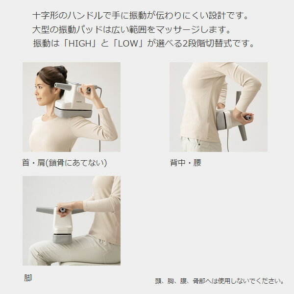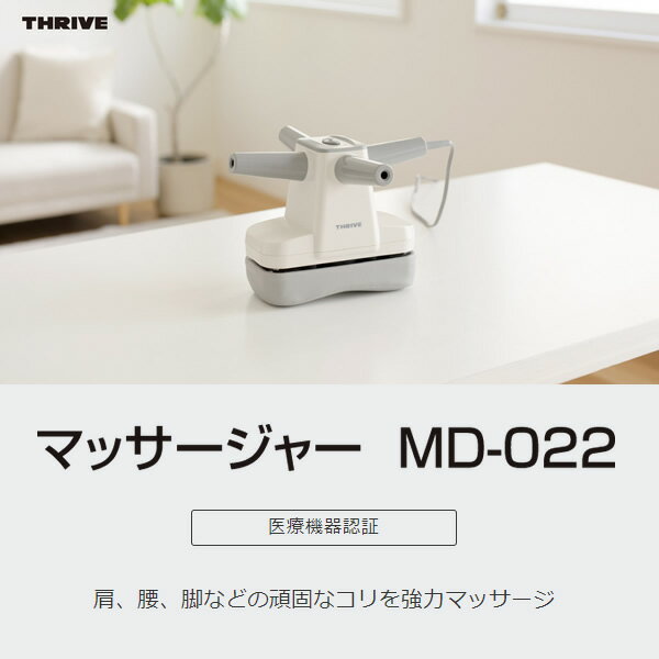 ■ THRIVE(スライヴ) ■肩、腰、脚などの頑固なコリを強力マッサージ。十字形のハンドルで手に振動が伝わりにくい設計です。大型の振動パッドは広い範囲をマッサージします。振動は「HIGH」と「LOW」が選べる2段階切替式です。◆ 主な特長 ◆◆ 主な仕様 ◆医療機器認証番号220AGBZX00070A02医療機器の種類管理医療機器一般的名称家庭用電気マッサージ器定格AC100V 50/60Hz 13W定格時間20分振動回数HIGH 約3500回/分 LOW 約2800回/分外形寸法幅 約29cm×奥行 約30cm×高さ 約21.5cm質量約1.8kg電源コード長さ約2.6m材質本体 : ABS樹脂 振動パッド : 合成皮革付属品着脱ハンドル2本簡易商品仕様シリーズ名:-ブランド名:スライヴメーカー型番:MD-022代表カラー:ベージュ本体横幅:29cmカラー:ベージュブランド名(カナ):スライヴ