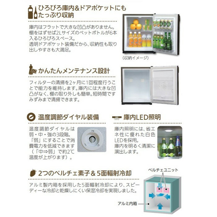 ■ 三菱電機エンジニアリング ■モダン&レトロ・上品な木目調デザインであなたの部屋をよりラグジュアリーに◆ 主な特長 ◆●ひろびろ庫内&ドアポケットにもたっぷり収納●フィルターの清掃を2ヶ月に1回行うだけでいい、かんたんメンテナンス設計●温度調節ダイヤルは弱・中・強の3段階で、簡単に設定できます●庫内照明には省エネ性に優れた白色LEDを採用●2つのペルチェ素子&5面輻射冷却により、スピーディーな冷却と簡素しにくい保湿冷却を実現◆ 主な仕様 ◆●製品仕様定格内容積:41L外形寸法(幅×奥行×高さ):450mm×458mm×550mm質量:16Kg定格電圧・定格周波数:100V・50/60Hz定格消費電力(50/60Hz):51/51w運転音:16dB冷却方式:電子冷却(ペルチェ方式)色:ダークブラウン(扉:木目調)付属品:庫内棚、ドアポケット(2個)、ボトルストッパー簡易商品仕様シリーズ名:GRAN PELTIERブランド名:三菱電機エンジニアリング|三菱電機|三菱メーカー型番:RK-40K3-M代表カラー:ブラウンドアの開き方:右開き定格内容積:40Lドア数:1シリーズ名(カナ):グラン・ペルチェ