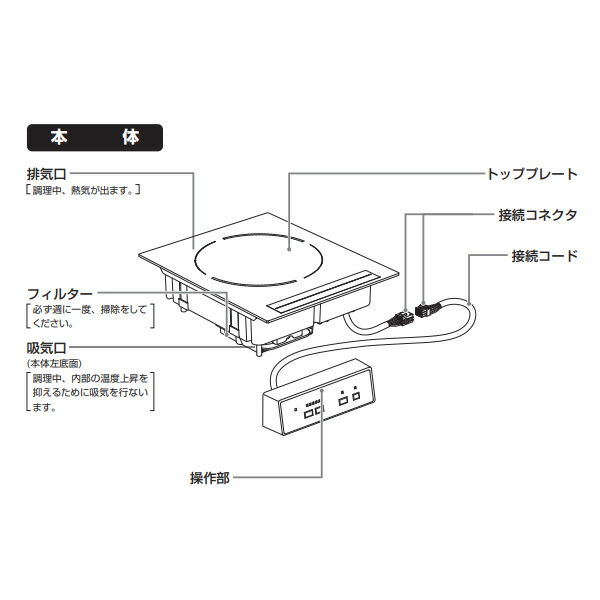 ■ 三化工業 ■ビルトイン型 客席IHヒーター (100Vタイプ) 操作部吊り下げ専用品 SIH-TH113BD-BK◆ 主な特長 ◆●フルフラットのIHなので段差ゼロ!カセットコンロと違って火が無く、段差がないので、なべの食材も取りやすく安心、安全です。また、近くにお飲み物をおいても温まりにくいです。● 操作部吊り下げ専用品◆ 主な仕様 ◆■型名:SIH-TH113BD■色:ブラック(BK)■定格:100V-1300W■大きさ:本体:幅320×奥行き320×高さ100.5mm■操作部:幅190×奥行き46×高さ58mm■重さ:約3.6kg■ヒーター消費電力:5段階切替え 300W(相当)・500・700・1000・1300W■コード:2.0mm 2芯ゴム平形コード 長さ2m■差込みプラグ:2極 15A・125V■安全機能:・切り忘れ防止:最終操作後約45分で自動OFF・鍋なし検知:鍋底センサーが鍋なしを検知し自動停止・温度過昇防止:空炊きなどにより、なべ底の温度が異常に上がると、自動的にヒーターの通電が止まります。その場合、電源スイッチを押し再度操作をし直してください。※火力が弱い場合や、なべの種類によっては通電が切れない場合があります。※炒め物などの高温料理をしたときに働くことがあります。・過熱防止:吸・排気口がふさがれたりして内部が異常に高温になると、自動的にヒーターの通電が止まります。温度が下がると自動で復帰します。・高温注意ランプ:調理中トッププレートが熱い間は高温注意ランプが点灯し、電源を切った後もトッププレートが熱い間は点滅しつづけてお知らせします。簡易商品仕様シリーズ名:-ブランド名:三化工業メーカー型番:SIH-TH113BD-BK代表カラー:ブラックコンロ口数:1