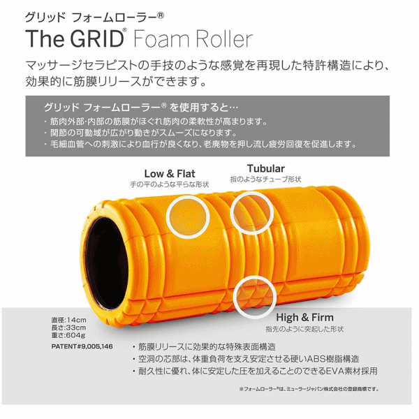 メーカー希望小売価格はメーカーカタログに基づいて掲載しています item-Information 【商品詳細説明】 ■メーカー ミューラー/トリガーポイント(Mueller/TRIGGER POINT) ■品名 グリッドフォームローラー ■品番/カラー 04401(ブラック) 04402(オレンジ) 04403(カモフラージュ) 04404(ピンク) 04405(ライム) 22069(カモフラージュブルー) 22106(カモフラージュグレー) ■サイズ 直径:14cm 長さ:33cm ■重量 約604g ■商品説明 The GRID Foam Roller(グリッドフォームローラー)は、マッサージセラピストの手技のような感覚を再現した特殊構造により、簡単にセルフマッサージを行うことができます。試合や遠征などに携帯可能な、長さ33cmのスタンダードモデル。 ■商品特徴 ■硬さレベル[2]・・・普通の硬さ トリガーポイントが推奨する通常の硬さ ■マッサージセラピストの手技を再現する特殊構造 ■コア(体幹)トレーニングも効果的に行える画期的なフォームローラー ■筋膜リリースをすることで全体のバランスを整え、身体が持っている 本来のパフォーマンスを発揮 ■プロのアスリートがSNS使用し、注目を集めています ■運動前後のウォームアップやクールダウンに最適 ■変形しにくいEVAを表面に使用、耐久性に優れ持ち運びにも便利 ■空洞の中芯部は体重負荷を支え、安定させる硬いABS樹脂構造 ■耐荷重227kgまで可能 ■検索用キーワード ミューラー ミューラージャパン Mueller トリガーポイント TRIGGER POINT フォームローラー ローラー マッサージ マッサージ用品 マッサージグッズ セラピスト セルフケア セルフマッサージ 簡易マッサージ 家トレ 宅トレ 部屋トレ トレーニング 正規品 国内正規品 日本正規品 スポーツ用品はUS−NEXTスポーツ(内山スポーツ)