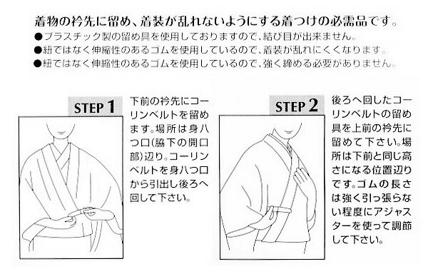 通常より長めに作られた長尺のコーリンベルトです。 着物の衿元を止め、着崩れしないようにする必需品です。 ゴムを使用していますので、締め付け感が少なく、緩みやシワになりにくいです。留め具部分はプラスティック製で着物を傷めません。ゴムの長さも調整でき、アジャスターでしっかりとまるので緩みません。 たもと留めにも使用できる便利なアイテムです。 <サイズ> Lサイズ 約40cm~78cm <素材> 留め具:ポリカーボネート100% 織ゴム:ナイロン70% ポリエステル15% ポリウレタン15% <品質> 日本製