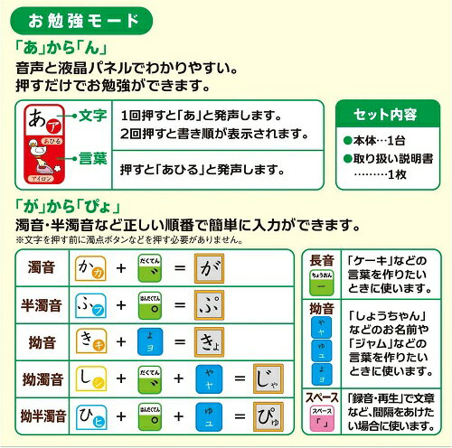 特長:文字と言葉を「ひらがな」と「カタカナ」で学べます。音声で「読み」から液晶パネルで「書き順」まで、言語能力の基礎がしっかりと身につきます。録音・再生機能を使うと、言葉や文章の作成ができ、より知識の幅も広がります。 ●サイズ・仕様:W215×H277×D25mm ●ひらがな、カタカナ、書き順、言葉、録音・再生 ●問題モード全215問 ●対象年齢 2歳から ●使用電池 単3アルカリ乾電池×2本(別売)特長:文字と言葉を「ひらがな」と「カタカナ」で学べます。音声で「読み」から液晶パネルで「書き順」まで、言語能力の基礎がしっかりと身につきます。録音・再生機能を使うと、言葉や文章の作成ができ、より知識の幅も広がります。 ●サイズ・仕様:W215×H277×D25mm ●ひらがな、カタカナ、書き順、言葉、録音・再生 ●問題モード全215問 ●対象年齢 2歳から ●使用電池 単3アルカリ乾電池×2本(別売)