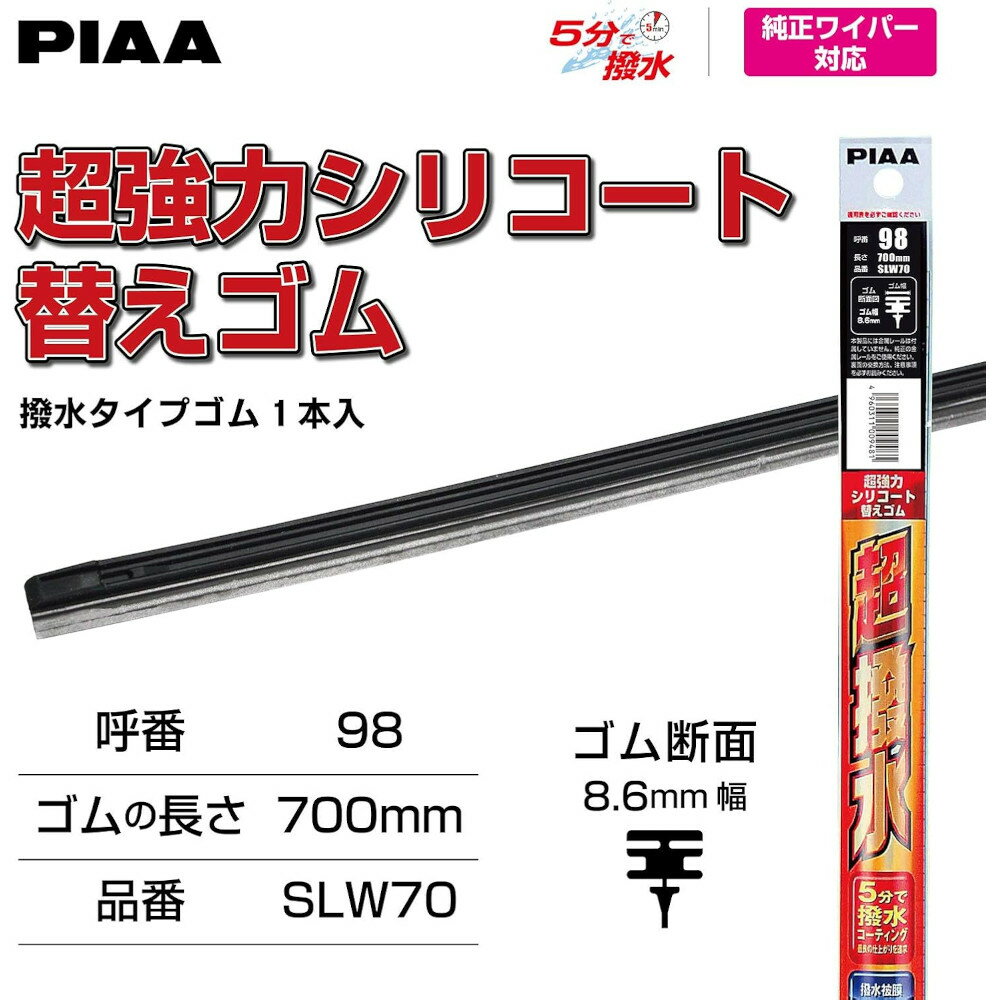 ■注意事項ご購入前に必ずメーカー適合検索をご確認の上、適切な製品をお選びください。適用以外の製品は絶対に取り付けないでください。記載なき車両への取り付けにより発生した不具合、車種適合誤りによるご購入後の返品は一切責任を負いかねますのでご了承ください。適合検索サイトはこちらhttps://link.rakuten.co.jp/0/154/895/商品説明メーカーPIAA長さ700mm入数1本PIAA ワイパー替えゴム 撥水コーティングタイプ 700mm 1本入 呼番98 SLW70●超撥水!わずか5分作動させるだけで雨を弾く、超強力シリコートワイパー用替えゴム。●ゴムは撥水機能を持つ最高品質のシリコンゴムを採用。●シリコンゴムにはPIAA独自のシリコンオイルを配合。これによりわずか5分で撥水被膜の形成を可能としています。●ガラスに撥水コーティングをされている車でも使用可能。●撥水効果は使い続ける事で撥水被膜を再度成型するので、安全な視界を確保出来ます。■ご注意商品仕様・適合等はメーカーホームページにてご確認下さいませ。■備考・商品画像は、お使いのモニターの指定や閲覧環境、お部屋の照明などにより実際の商品と色味が異なる場合がございます。あらかじめご了承のうえお買い求めください。・品質向上やデザイン変更などにより、予告なくパッケージ・取扱説明書の内容などが変更になる場合がございます。■エコ梱包のご案内