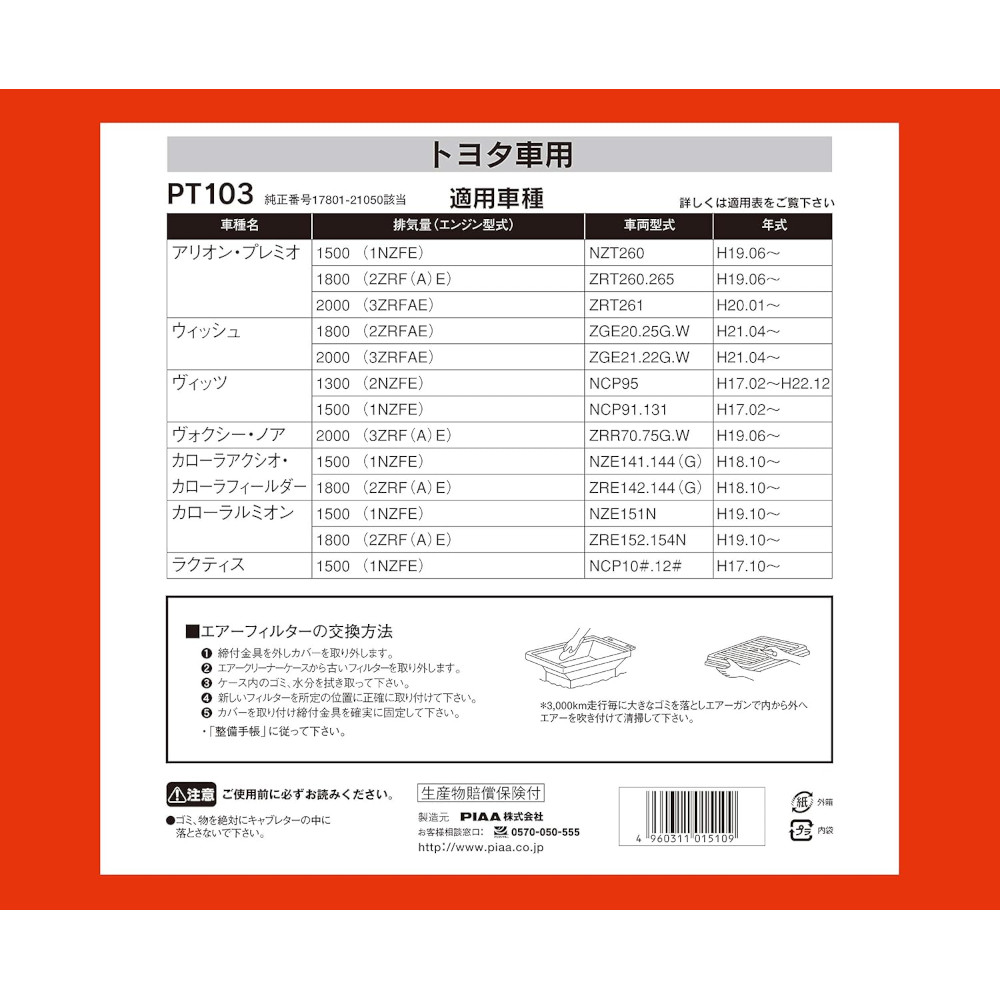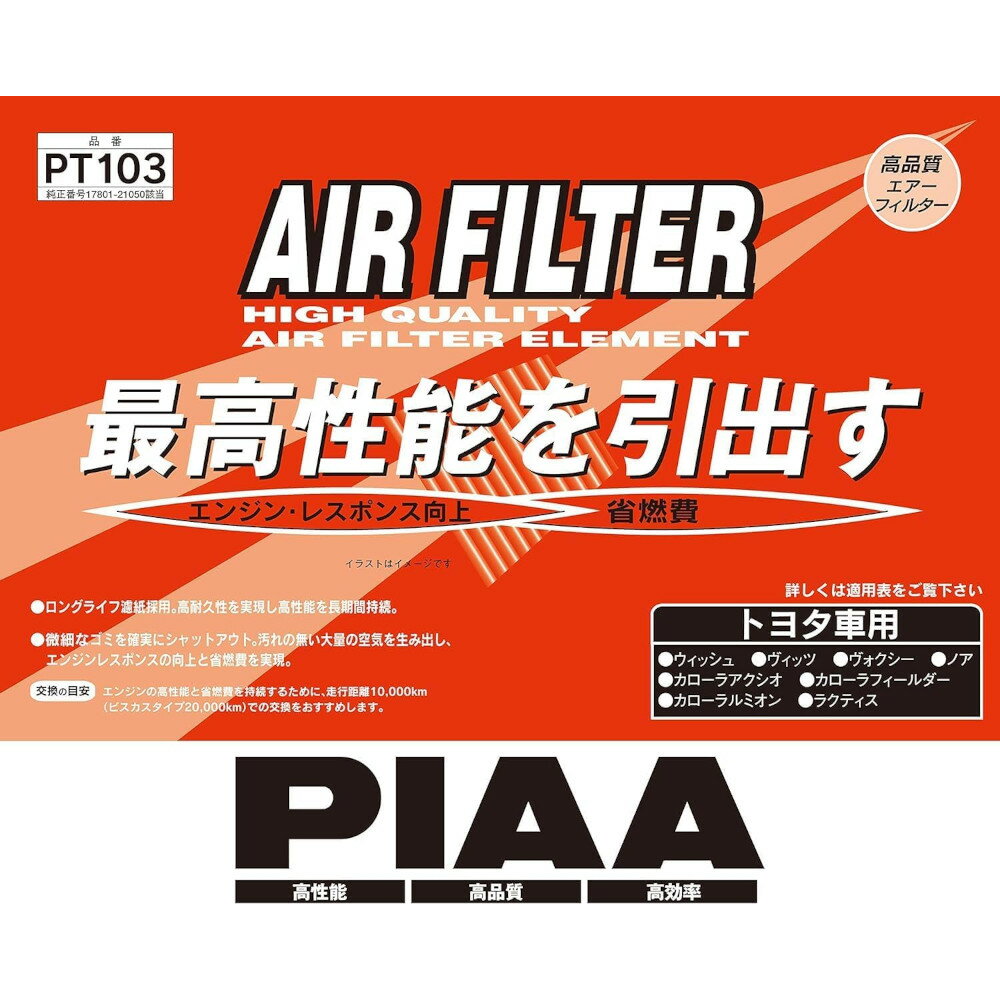 ■注意事項ご購入前に必ずメーカー適合検索をご確認の上、適切な製品をお選びください。適用以外の製品は絶対に取り付けないでください。記載なき車両への取り付けにより発生した不具合、車種適合誤りによるご購入後の返品は一切責任を負いかねますのでご了承ください。適合検索サイトはこちらhttps://link.rakuten.co.jp/0/154/895/商品説明メーカーPIAA該当純正品番17801-21050/1M00-23-603交換の目安エンジンの高性能と省燃費を維持するための目安は、ドライタイプ=乾式は走行距離10,000km(ビスカスタイプ=湿式エアーフィルターは20,000km)での購入をおすすめします。適合車種トヨタ車用:ウィッシュ・ヴィッツ・ヴォクシー_他入数1個PIAA エアーフィルター トヨタ車用 1個入 PT103高性能を引き出すエアーフィルタです。ロングライフ濾紙採用により高耐久性を実現し高性能を長時間維持します。微細なゴミを確実にシャットアウト。それにより汚れの無いクリーンな空気でエンジンレスポンスの向上と省燃費を実現します。■詳細適合車種【トヨタ ウィッシュ】車両型式:ZGE20G.20W.21G.22W.25G.25W年式:H21.04〜H29.10【トヨタ ヴィッツ】車両型式:NSP130.NCP91.95.131年式:H17.02〜R2.03【トヨタ ヴォクシー】車両型式:ZRR70G.70W.75G.75W.80G.80W.85G.85W年式:H19.06〜R4.01■ご注意エアーフィルターをご購入の際は、必ず適用表をご確認の上、適切な製品をお選びください。■備考・商品画像は、お使いのモニターの指定や閲覧環境、お部屋の照明などにより実際の商品と色味が異なる場合がございます。あらかじめご了承のうえお買い求めください。・品質向上やデザイン変更などにより、予告なくパッケージ・取扱説明書の内容などが変更になる場合がございます。■エコ梱包のご案内