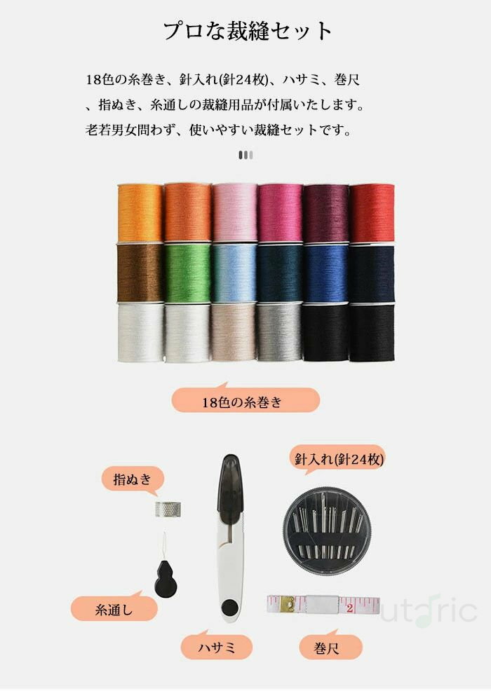 商品名:縫製セット 素材:PP 重さ:約210g サイズ:約13*13*6.5cm セット内容:糸巻き*18、針入れ(針24枚)、ハサミ*1、巻尺*1、指ぬき*1、糸通し*1、収納ケース*1 生産国:中国 18色の糸巻き、針入れ(針24枚)、ハサミ、巻尺、指ぬき、糸通しの裁縫用品が付属いたします。 老若男女問わず、使いやすい裁縫道具セットです。 道具セットがしっかりと収納され、失われることは心配がありません。 重さはわずか210gで持ち運びに便利です。初心者やDIYの裁縫習いなどに最適! お家またお出かける時にでボタン外れ、服の破れの修理に使われます。 母の日、誕生日、クリスマスなどのプレゼントとして最高!商品名:縫製セット 素材:PP 重さ:約210g サイズ:約13*13*6.5cm セット内容:糸巻き*18、針入れ(針24枚)、ハサミ*1、巻尺*1、指ぬき*1、糸通し*1、収納ケース*1 生産国:中国 18色の糸巻き、針入れ(針24枚)、ハサミ、巻尺、指ぬき、糸通しの裁縫用品が付属いたします。 老若男女問わず、使いやすい裁縫道具セットです。 道具セットがしっかりと収納され、失われることは心配がありません。 重さはわずか210gで持ち運びに便利です。初心者やDIYの裁縫習いなどに最適! お家またお出かける時にでボタン外れ、服の破れの修理に使われます。 母の日、誕生日、クリスマスなどのプレゼントとして最高!