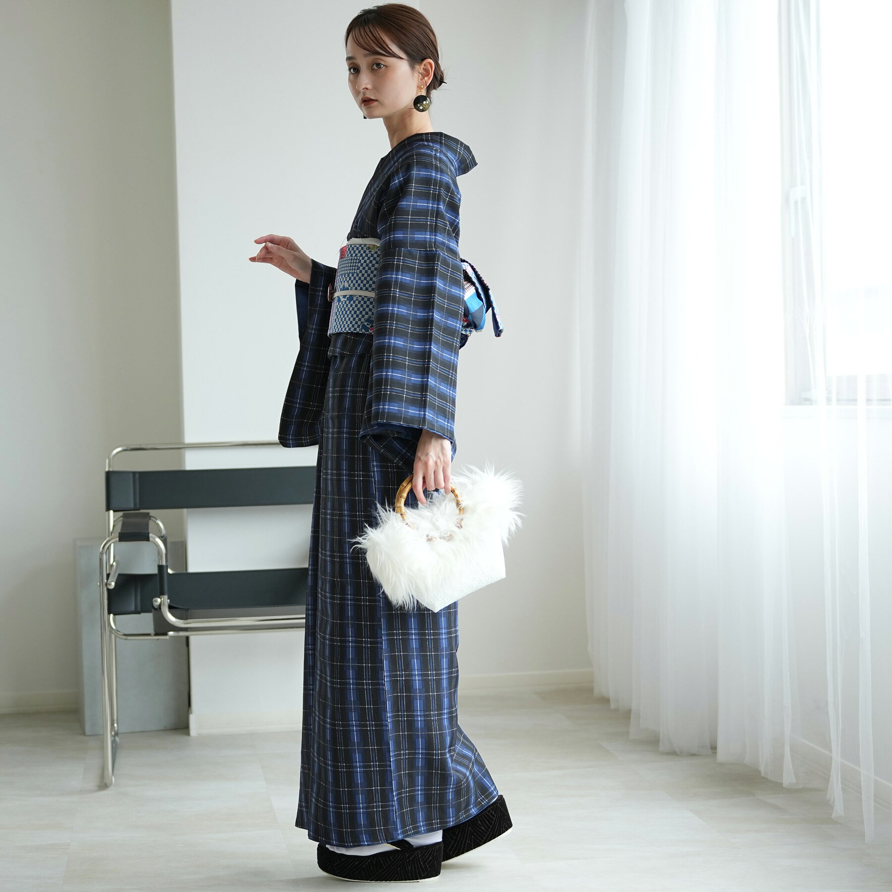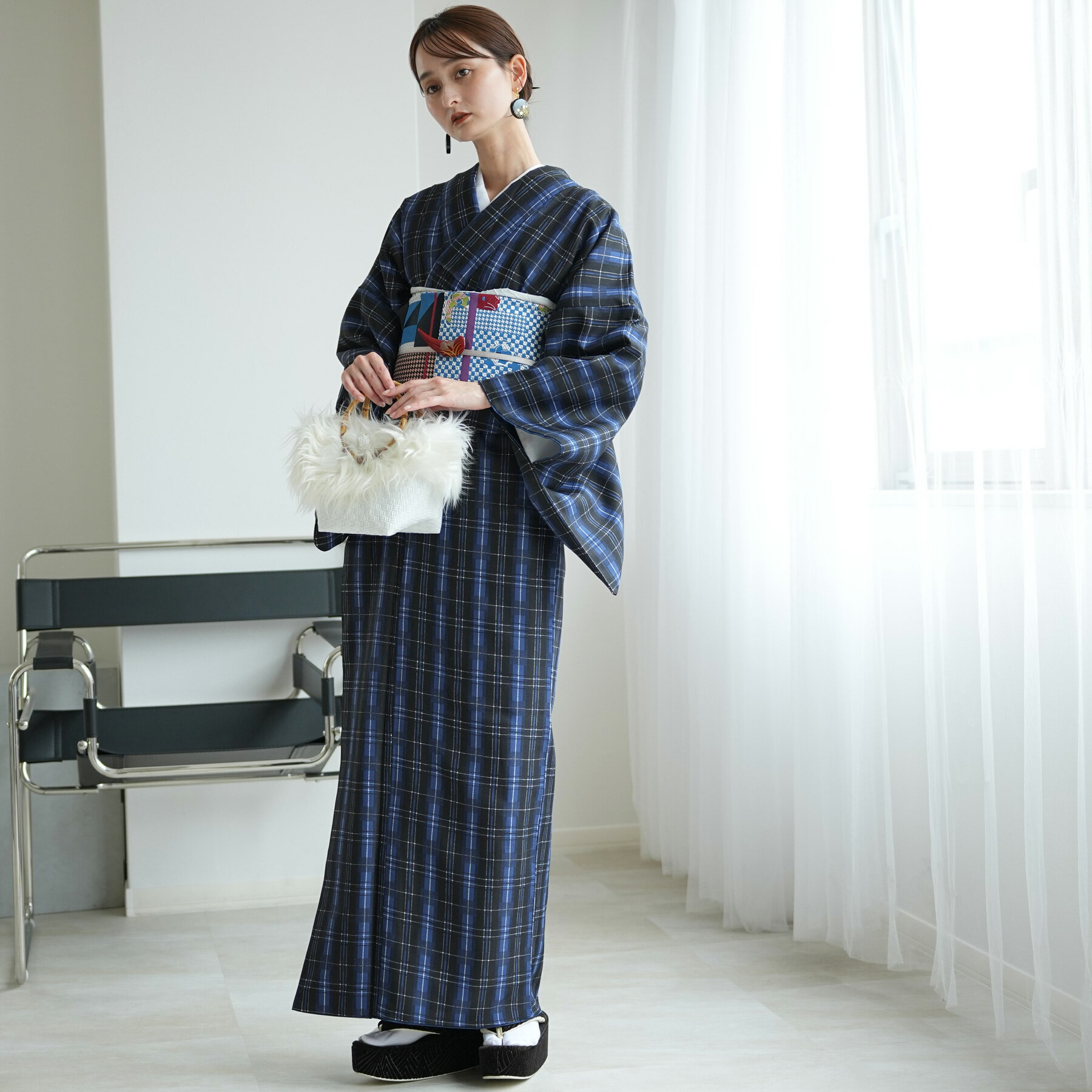 【着物 袷着物 ブルー×ブラックのタータンチェック】洗える着物 きもの単品 着物 街着 袷着物 秋冬 カジュアル着物 女性 大人 レディース 着付け お稽古 Lサイズ ポリエステル着物