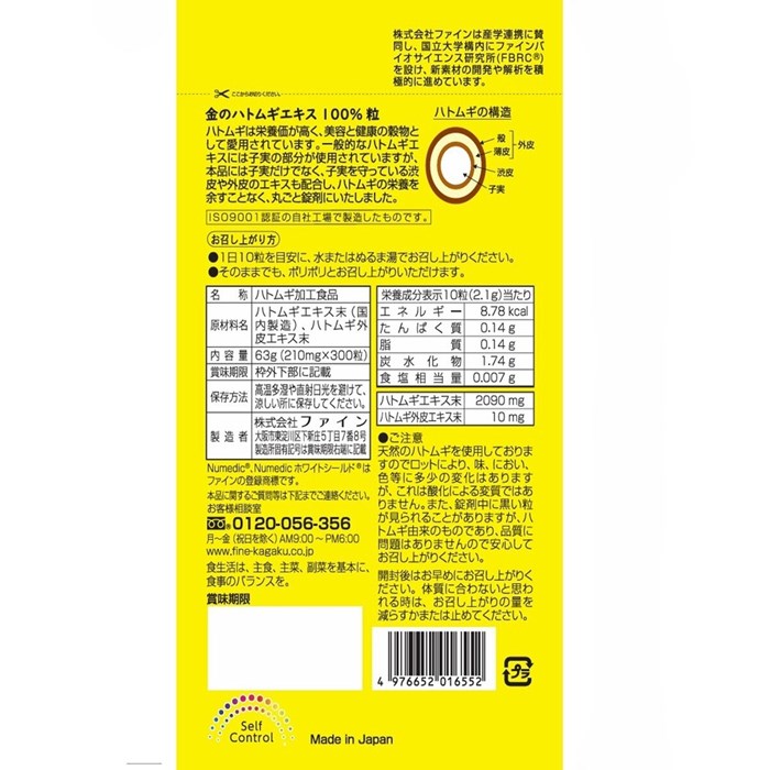 金のハトムギエキス 100% 300粒 x 3袋セット(900粒) COIX SEED TABLET 300CT ・サイズ:100×180×58mm(幅×高さ×奥行) ・内容量:63g(210mg×300粒) ・原材料:ハトムギエキス末(国内製造)、ハトムギ外皮エキス末 ・栄養成分(10粒当たり):エネルギー 8.78kcal、たんぱく質 0.14g、脂質 0.14g、炭水化物 1.74g、食塩相当量 0.007g、ハトムギエキス末 2,090mg、ハトムギ外皮エキス末 10mg ・製造国:日本 自然由来の「ハトムギエキス」がカラダの内側から透明感を引き出し、イキイキと美しい毎日をサポート。ファインのハトムギは独自の「酵素分解法」により抽出・エキス化をしています。一般的なハトムギエキスには、子実の部分が使用されていますが、それ以外の部分(渋皮、殻)にも数多くの栄養素が含まれており子実だけでなく、外皮(渋皮、殻)のエキスも配合しています。1日10粒を目安に、水またはぬるま湯でお召し上がりください。 特徴 その他 ●広告文責:彩虹貿易合同会社 070-9243-7340 メーカー名/販売者名:ファイン 原産国:日本 商品区分:サプリメント