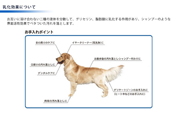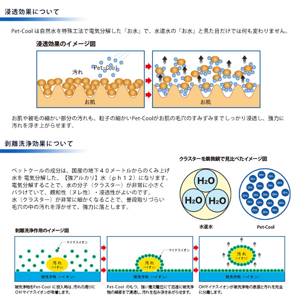 浸透力に優れた自然水100%の電気分解水 高濃度活性水素水の優れた洗浄効果で、汚れ・雑菌を強力分解。 【浸透効果と乳化効果】 薬品を使用せずに毛穴の奥のすみずみまで(浸透)汚れを落とし、被脂を分解(乳化)する事で、シャンプーのような洗浄効果が得られます。汚れ落としだけでなく、お肌のお手入れやデンタルケア、幼犬・老犬のシャンプー代わり、またシャンプー後のボディケアにも、毎日お手軽にご使用いただけます。 ■成分:自然水100% ■液性:アルカリ性/pH:12 ■内容量:スプレー 300ml ■消費期限:ボトルに貼付記載。(開封後は常温で1年間) ■安全データ:日本食品分析センター/生活科学研究所/日本獣医畜産大学:臨床済 ■使用上の注意 ※尿結石を患っているペット、または兆候があるペットへのご使用はお控えください。 ※アレルギー等を患っているペットへのご使用は掛かり付けの獣医師にご相談頂いてからご使用下さい。 ・白い沈殿物がでますが、天然ミネラル成分の結晶です。品質上問題ございませんので、振ってご使用ください。 ・医療目的のご使用はご遠慮ください。 ・最初のスプレーに限り、アルコールの臭いがする場合がありますが、品質上問題ございません。 ・過度の大量使用、目、口に入れる行為はお止めください。 ★Pet-Cool(ペットクール)全ラインナップ ●たっぷり使える大容量♪トイレに流せるネオティッシュPet-Cool は自然水を特殊工法で電気分解した「お水」で、水道水の「お水」と見た目だけでは何も変わりません。では何故、Pet-Cool は浸透力に優れているのか、目で見てもお解りいただけるようにお茶葉を使って実験してみました。 お肌や被毛の細かい部分の汚れも、粒子の細かいPet-Coolがお肌の毛穴のすみずみまでしっかり浸透し、強力に汚れを浮き上がらせます。 ペットクールの成分は、国産の地下40メートルからのくみ上げ水を 電気分解した、【強アルカリ】水(ph12)になります。電気分解することで、水の分子(クラスター)が非常に小さくバラけていて、親和性(ヌレ性)・浸透性がよいのです。水(クラスター)が非常に細かくなることで、普段取りづらい毛穴の中の汚れを浮かせて、強力に落とします。 ごま油を用意し、水道水とPet-Coolを投入してみました。 通常ごま油と水ははっきりと分離しますが、ごま油とPet-Coolは瞬時に混ざり乳化します。 お互いに溶け合わない二種の液体を分散して、グリセリン、脂肪酸に乳化する作用があり、シャンプーのような界面活性効果でベタついた汚れを落とします。