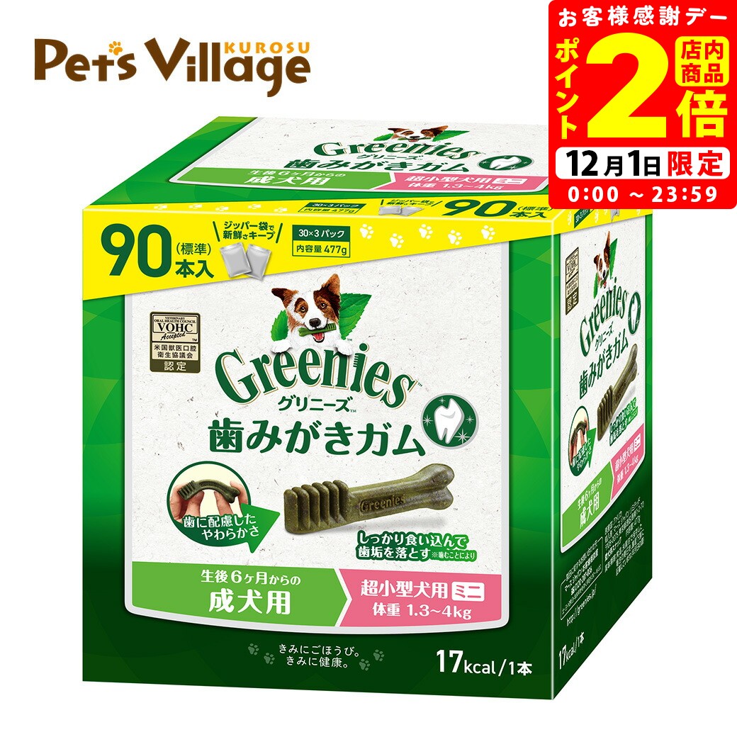 \今だけ!数量限定/ 何かが、おまけについてくる?!?! 届くまでは、ドキドキ・ワクワク・・・ どうぞ!お楽しみに♪ ※おまけの内容は不定期に変更となる可能性がございます。 ※数量限定のため、おまけが終了することもございます。 ※予めご了承ください。 「目の健康維持 ブルーベリー入り」は基本の食材とオーラルケアの効果は従来のグリニーズプラスそのままに、目の健康維持に配慮してブルーベリーを配合しています。ブルーベリーに含まれるアントシアニンは目の働きをサポートし、目の健康維持への効果が期待されています。 ■原材料:小麦粉、小麦タンパク、ゼラチン(豚由来)、オーツ麦繊維、タンパク加水分解物、乾燥ブルーベリー、乾燥リンゴ、グリセリン、レシチン、ビタミン類 (A、B1、B2、B6、B12、D3、E、コリン、ナイアシン、パントテン酸、ビオチン、葉酸)、ミネラル類 (カリウム、カルシウム、クロライド、セレン、マグネシウム、マンガン、ヨウ素、リン、亜鉛、鉄、銅)、着色料(スイカ色素、ゲニパ色素、ウコン色素) ■代謝エネルギー:約26kcal/1本 ■原産国:米国 【お知らせ】 リニューアルに伴い、パッケージ・内容等予告なく変更する場合がございます。また、リニューアル時期は旧製品と新製品が混同する場合がございます。予めご了承ください。 ご購入後、商品に不備・不良等がございましたら、下記製造メーカーまでお問い合わせくださいますよう、お願い致します。 ■ニュートロ・グリニーズ お客様相談室 〒113-0033 東京都文京区本郷3-14-11 日平本郷ビル 0120-207-006 平日9:30-16:00 (土日、祝祭日、年末年始12月27日-1月4日を除く)1日1本!噛んで実感!歯みがき効果。歯みがき専用ガム「グリニーズ プラス」。 しっかり噛める弾力性と形状で高い歯みがき効果を発揮。噛んでしつこい歯垢を落とします。 グリニーズ プラスは、Veterinary Oral Health Council(米国獣医口腔衛生協議会)から、から歯垢や歯石の蓄積のコントロールを助ける効果があると承認されています。 各体重別カテゴリーで最も噛む力の強い愛犬でも安心して噛める硬さ、噛むことで効率的に歯垢をつきにくくする弾力性により、優れた歯みがき効果を実現しています。 主原料は100%自然素材。果実類など、こだわりの自然素材を使用しています。 また、アレルゲンとなりにくいといわれる高品質な豚由来のゼラチンや、米粉などを使用し、食物アレルギーにも配慮しています。 愛犬の健康維持をサポートする“総合栄養食”としての基準を満たしています。主食と同等の栄養バランスを満たしているから、栄養を偏らせることなくフードと組み合わせることができます。 さらに、溶解性の高いタンパク質を使用することで、ドライドッグフードよりも優れた消化性を実現しています。(ニュートロジャパン調べ) ※高い消化性を実現する製法について特許申請中。 ●成犬用 目の健康維持 超小型犬用 2-7kg 「目の健康維持 ブルーベリー入り」は基本の食材とオーラルケアの効果は従来のグリニーズプラスそのままに、目の健康維持に配慮してブルーベリーを配合しています。ブルーベリーに含まれるアントシアニンは目の働きをサポートし、目の健康維持への効果が期待されています。 原材料 小麦粉、小麦タンパク、ゼラチン(豚由来)、オーツ麦繊維、タンパク加水分解物、乾燥ブルーベリー、乾燥リンゴ、グリセリン、レシチン、ビタミン類 (A、B1、B2、B6、B12、D3、E、コリン、ナイアシン、パントテン酸、ビオチン、葉酸)、ミネラル類 (カリウム、カルシウム、クロライド、セレン、マグネシウム、マンガン、ヨウ素、リン、亜鉛、鉄、銅)、着色料(スイカ色素、ゲニパ色素、ウコン色素) 保証成分 たん白質 30.0%以上 脂質 5.5%以上 粗繊維 6.0%以下 灰分 6.0%以下 水分 15.0%以下 代謝エネルギー 26kcal/1本 給与方法・ご注意事項 ・1日に1本を目安に与えてください。 ・年齢6ヶ月以上の愛犬に与えてください。 ・主食の量は適宜調節してください。 ・愛犬の体重に適したサイズを与えてください。 ・常に新鮮な水をご用意ください。 ※食べ終わるまで目の届く所で与えてください。飲み込んでしまった時やのどにつかえているような場合は、生命に関わることもありますので、あわてずに取り出すか、獣医師に相談してください。 原産国 アメリカ 1本入 6本入 30本入 60本入って超お得!ボックスタイプ(デカパック) グリニーズプラス 全ラインナップ