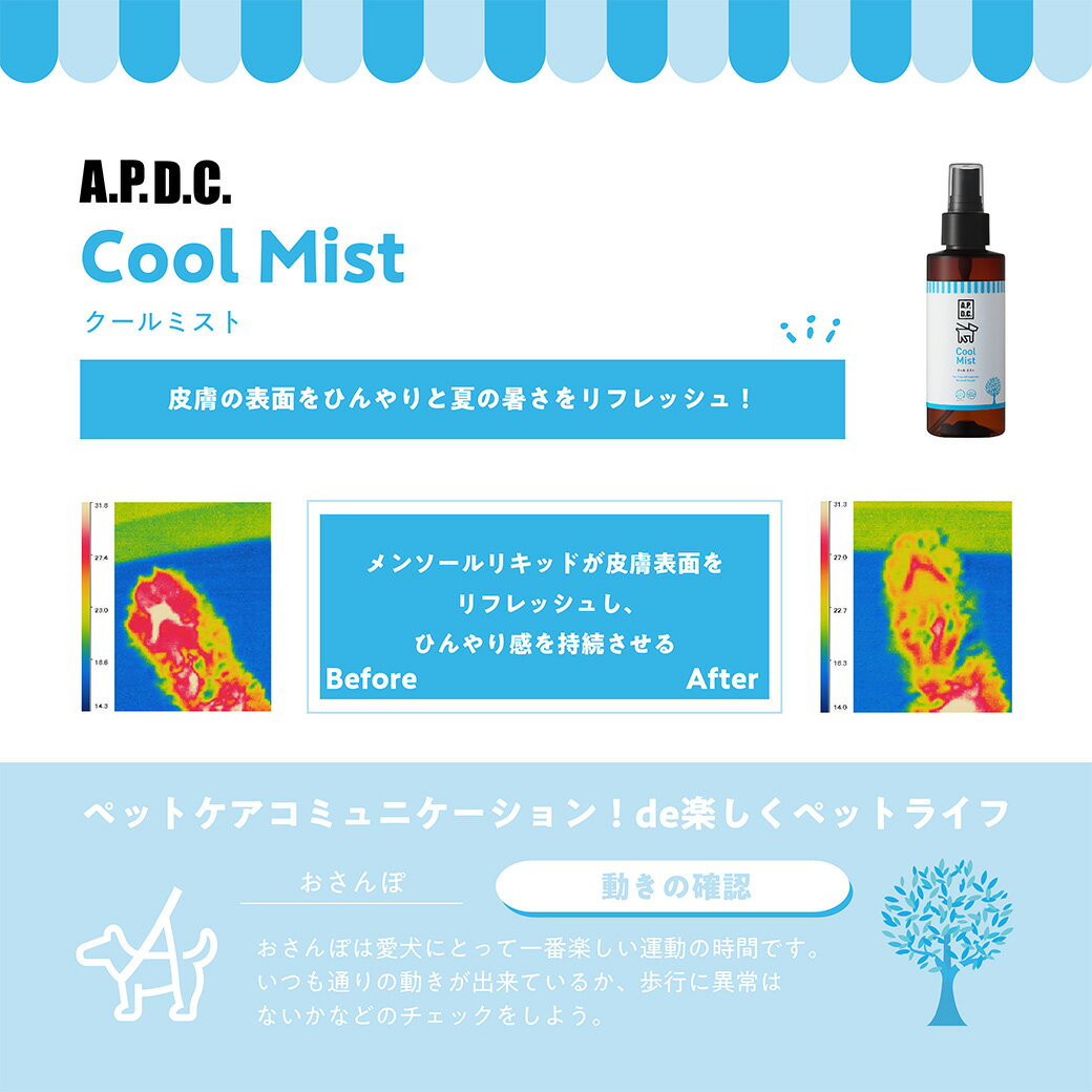 皮膚に清涼感を与えるスプレー! メンソールリキッドが皮膚表面を冷やし、ひんやり感を持続させるスプレーです。 すぐに体温が上がる夏場のお散歩や、高温になりやすい車の中など、暑がっているときにお使いください。 ■配合成分 ティーツリーオイル・ハイドロゾル(芳香蒸留水)、メンソールリキッド、ペンチレングリコールなど ■原産国:オーストラリア ■使用方法 犬の被毛をかき分け、適量を直接地肌にスプレーします。 特に肉球や脇やおなかなど、被毛が少ないところにスプレーをすると、より効果的です。 必要に応じて1日に数回ご使用いただけます。 ■製品に関するお問い合わせ先 株式会社たかくら新産業 〒106-0031 東京都港区西麻布2-13-6 K’s 西麻布3F お問合せ先:0120-828-290