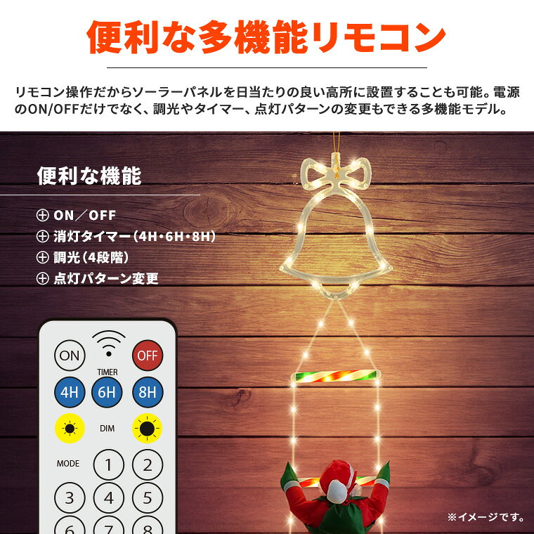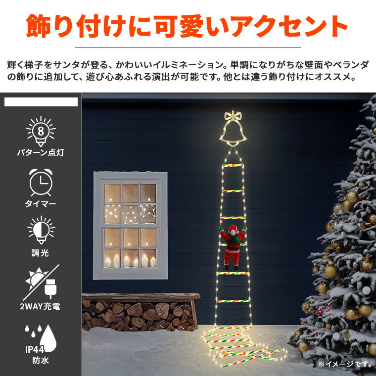 ソーラー イルミネーション はしごサンタ クリスマス飾り 2WAY充電 ゴールド リモコン操作 屋外用 防水 かわいい led ロープライト モチーフ サンタクロース 梯子 電飾 オーナメント 調光 消灯タイマー 自動点灯 USB充電 ベランダ 庭 樹木 玄関