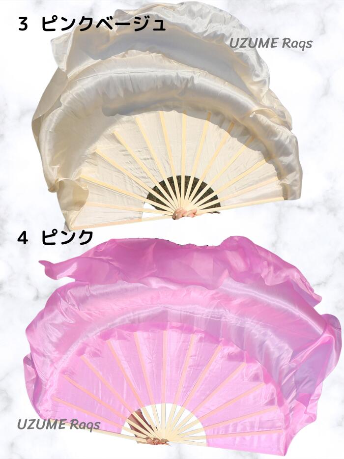 【特注/親指小指部分の補強対応】専用ページ 扇の親指と小指の部分に、厚めのシルクを重ね補強し、激しいファンの動作に対応します。 ※特注カラーオーダー可 ビッグファンベール お取り寄せ ※両手用です。 片手用のページもございます。 通常のファンベールより扇が大きいです。 “開閉を繰り返しても丈夫な作り”に徹底しました。 瞬時に扇を開く動作に強いので、踊りやすいと評判です♪ 扇のネジは、緩めたり締めたりと自由自在に調整可能で便利です。 また、光沢ある上品な高級チャイナ・シルクにより、ふんわり優しく美しいファンベールの舞を楽しめます。 国内外の多くのダンサーに愛用されている、実績あるファンベール。 中国産高級シルクを、職人の手で一枚一枚丁寧に染色し、作製されたハンドメイド商品です。 中国製 【素材】 ★扇部分:竹 ※ササクレが気になる場合は、マニキュアなどのトップコートを扇の竹の部分に塗ると安心です。 ★ベール:高級チャイナシルク ※ご購入時、ベールにはシワがございます。 気になる方は、軽くスチームアイロンをかけるか、 霧吹きで水をかけて湿らせ自然乾燥をすると シワがのびて見栄えがよくなります。 (スチームアイロンのかけすぎにご注意ください) 【サイズ】 扇の大きさ(開いた時):直径約75cm 扇の長さ:約39cm ベールの長さ 扇+ベールの長さ:約39cm+66cm サイズにつきましては画像に記載がございます。 ※画像[お買い上げになる前に]を必ずご一読ください。