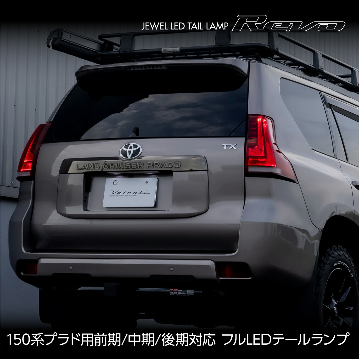 【ITEM INFORMATION】 メーカー名:ヴァレンティ [valenti] 商 品 名:トヨタ 15#ランドクルーザープラド ジュエルLEDテールランプREVO 適合車種 :トヨタ ランドクルーザープラド 前期/中期/後期型 全グレード対応 【前期型】型式:GRJ15#W/TRJ150W 年式:2009.9 ~ 2013.8 【中期型】型式:GRJ15#W/GDJ15#W/TRJ150W 年式:2013.9 ~ 2017.8 【後期型】型式:GDJ15#W/TRJ150W 年式:2017.9 ~ カラー :・レッドレンズ/グロスブラック/クリアバー ・ライトスモーク/ブラッククローム/クリアバー 品 番 :TT150PRD-RG-1 / TT150PRD-SB-1 セット内容:テールランプ左右、取り付けキット、取付説明書 そ の 他:保安基準適合、Eマーク取得済み、1年保証 ※保証期間内であっても、下記の場合は保証致しません ◆保証書及び納品書の提示がない場合 ◆保証書の字句を書き換えられた場合 ◆取付作業、使用上の誤り、不注意、過失による故障・損傷・水漏れ ◆不当な修理、改造及び分解による故障・損傷・水漏れ ◆火災・地震・風水害、異常電圧、公害などその他天災地変による故障・損傷・水漏れ ◆交通事故による故障・損傷・水漏れ ◆適合車種以外に使用したことによる故障・損傷・水漏れ ◆車両の他の部分へ及ぼした故障・損傷 ◆取付け、取外しに関わる作業工賃 ※本保証規定は日本国内においてのみ有効です42LED+4LEDライトバーを採用! 点灯パターン ポジション/ブレーキ、ウインカー、バック オール高輝度LEDモデル!! シーケンシャルウインカー(流れるウインカー)採用! 法改正により日本国内でも保安基準適合となった 「シーケンシャルウインカー」を採用! テールランプ本体で「流れる」「流れない」の設定可能! アウターレンズ形状、整流フィン! 純正テールランプをイメージさせる、 アウターレンズ形状、整流フィンを採用。 ハイフラッシュ制御抵抗内蔵! ハイフラッシュ制御抵抗をテール本体に内蔵、 ハイフラッシュ現象の心配もなし! 取付は純正カプラーを使用するカプラーオンタイプです。 後期型装着用、専用パーツ付属! 専用ガーニッシュ、専用バンパーリテーナー付属で、 後期型(2017.9〜)の車両へも取り付け可能! カラーバリエーション レッドレンズ/グロスブラック/クリアバー 品番:TT150PRD-RG-1 JAN:4589888758556 ライトスモーク/ブラッククローム/クリアバー 品番:TT150PRD-SB-1 JAN:4589888758563 ● 保安基準適合 ● 1年保証 Eマーク取得済み。保安基準適合製品です。 【適合車種】 ●トヨタ ランドクルーザープラド 前期/中期/後期型 全グレード対応 【前期型】型式:GRJ15#W/TRJ150W 年式:2009.9 ~ 2013.8 【中期型】型式:GRJ15#W/GDJ15#W/TRJ150W 年式:2013.9 ~ 2017.8 【後期型】型式:GDJ15#W/TRJ150W 年式:2017.9 ~ 標準作業時間 0.5時間(前期/中期型) 2.0時間(後期型)