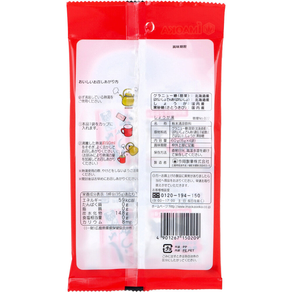 国内産しょうが100%使用。 注意)商品名先頭に【※】マークは軽減税率対象品目です。 簡単!!お湯をそそぐだけで体も心もホッカホカ!! 【名称】 粉末清涼飲料 【原材料名】 グラニュー糖(甜菜(北海道産))、ばれいしょでん粉(遺伝子組換えではない)、しょうが、黒砂糖 【栄養成分表示(1杯分(15g)あたり)】 エネルギー:59kcaL たんぱく質:0g 脂質:0g 炭水化物:14.8g 食塩相当量:0g カリウム:8mg 【おいしいお召しあがり方】 ・必ず沸騰している熱湯をご使用ください。 (1)本品1袋をカップに入れます。 (2)沸騰した熱湯約90mLをそそぎ、よく溶かしてお召しあがりください。(お好みにより熱湯の量を加減してお召しあがりください。) 【保存方法】 直射日光、高温多湿を避けて保存してください。 【注意】 ・熱湯使用の際、やけどをしないようご注意ください。 ・開封後はお早めにお召しあがりください。国内産しょうが100%使用。 注意)商品名先頭に【※】マークは軽減税率対象品目です。 簡単!!お湯をそそぐだけで体も心もホッカホカ!! 【名称】 粉末清涼飲料 【原材料名】 グラニュー糖(甜菜(北海道産))、ばれいしょでん粉(遺伝子組換えではない)、しょうが、黒砂糖 【栄養成分表示(1杯分(15g)あたり)】 エネルギー:59kcaL たんぱく質:0g 脂質:0g 炭水化物:14.8g 食塩相当量:0g カリウム:8mg 【おいしいお召しあがり方】 ・必ず沸騰している熱湯をご使用ください。 (1)本品1袋をカップに入れます。 (2)沸騰した熱湯約90mLをそそぎ、よく溶かしてお召しあがりください。(お好みにより熱湯の量を加減してお召しあがりください。) 【保存方法】 直射日光、高温多湿を避けて保存してください。 【注意】 ・熱湯使用の際、やけどをしないようご注意ください。 ・開封後はお早めにお召しあがりください。