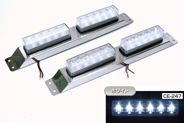 自由な発想で取付できるLEDマーカーメッキカバー付き。●材質 ABS樹脂 ●色 ブルー ●ピッチ(mm) 120(螺子) ●レンズ色 ブルー ●定格電圧(V) DC24(最大28) ●LED 12PCS ●寸法(縦×横×高さ)(mm) 約40×143×20 ●明るさ(Lm) 2.4W/200LM ※本製品はDC24V車専用です。それ以外には使用しないでください。