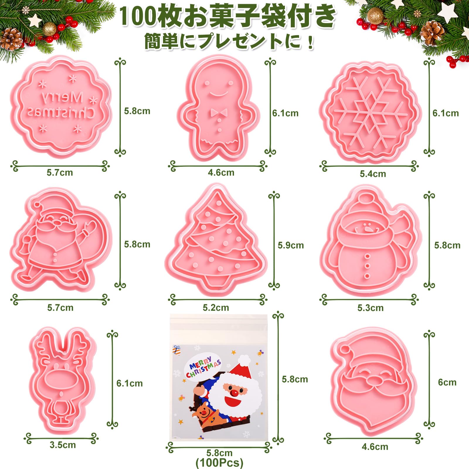 LIHAO クッキー 型 クリスマス 型抜き 抜き型 8個セット 【ラッピング袋×100枚付き】ケーキモールド サンタ スノー ツリー かわいい
