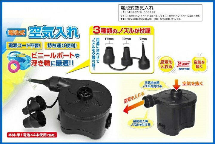 空気抜きにも対応 電池式空気入れポンプ 商 品 説 明 手動では大変なプールやエアベッドなどの空気入れに大変便利なアイテム。 単1乾電池4本で使用可能なバッテリータイプ電動ポンプ。コンセント電源不要なので、持ち運びに便利! 使う場所を選びません! ジャンボビニールプール、家庭用プール、キャンプにも用途多彩! 商 品 仕 様 サイズ 約14×11×11.5cm 電源 単1乾電池4本(別売) ノズルタイプ 3タイプ(17mm・12mm・7mm) 保 証 に つ い てこの商品には、メーカー保証がございません。初期不良品の場合のみ、商品到着から1週間以内であれば弊社で対応いたしますので、ご連絡ください。注 意 事 項●こちらの商品は、未使用新品です。●モニター環境により、実際のカラーと異なって見える場合がございます。 【ゆうパック優先配送の注意事項】(1) 締め切り時刻迄に決済が完了した注文が当日発送となります。(2) 店舗休業日のご注文は翌営業日の発送となります。(3) 商品名に「優先配送との同梱不可」の記載がある商品は優先配送商品との同梱はできません。(4) 商品名に「優先配送との同梱不可」の記載がされた商品が同梱されていた場合は、当日又は翌日発送されませんのでご注意下さい。(5) 同梱商品の中に「優先配送」の商品が1つ以上存在する場合は、配送方法に「定形外郵便」等、「優先配送」以外を選択した商品も「優先配送」で発送されます。※商品の発送は「ゆうパック」又は「ゆうパック優先配送」を選択できます。 ★送付先が北海道、沖縄、離島の場合は注文金額により以下の送料が必要です。・北海道の場合、注文金額が3,980円未満は880円、3,980円以上は送料無料です。・沖縄、離島の場合、注文金額が9,800円未満は880円、9,800円以上は送料無料です。
