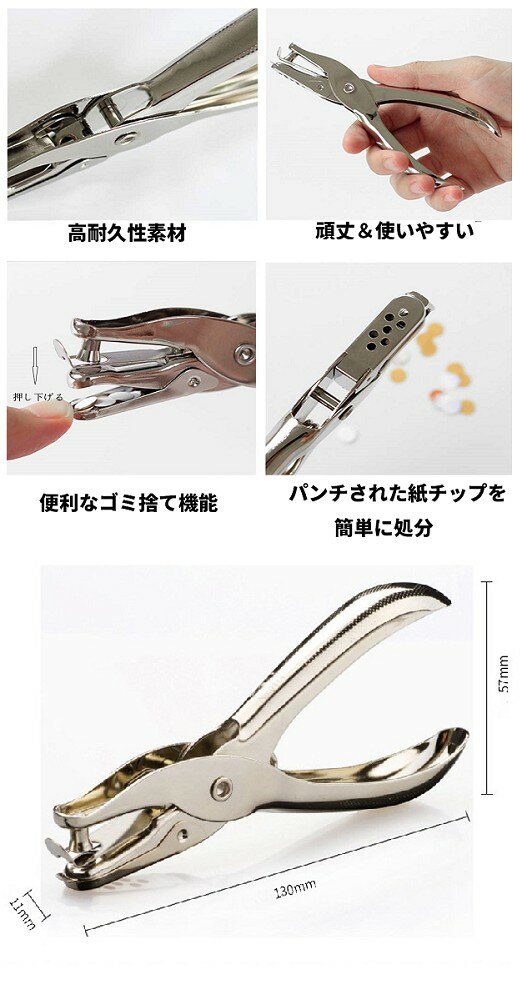 メタルハンドパンチ 3mm 商 品 説 明 【高耐久性素材】 耐久性の高い金属で作られ、錆びにくいハンドパンチです。 【頑丈&使いやすい】ハンドルは滑り止め設計がされ、より快適にグリップします。操作は簡単で、便利で省力的です。 【便利なゴミ捨て機能 】 穿孔されたゴミを掃除するのは簡単です。 ヒンジ付き区画は、パンチされた紙チップを保持。 ゴミを処分できるように簡単に開きます。便利な使い勝手で時間の節約につながり、古紙はテーブルや床に散らばりません。 【多種多様】 スクラップブック、子供のアートワーク、フォトフレームの装飾、ギフトタグ、グリーティングカードやチケットなどの様々な材料で手工芸品を作るために使用することができます。※輸入品の為、基本的に日本語説明書は付属しておりません。 商 品 仕 様 サイズ 長さ130×高さ57×幅11mm パンチ穴直径 3mm 重さ 54g 保 証 に つ い て ■メーカー保証なし 記載の注意事項を除く初期不良品の場合のみ、商品到着から1週間以内のみ対応いたします。 ご到着後はお早めに商品状態をご確認ください。 注 意 事 項 ●こちらの商品は、新品です。 ●モニター環境により、実際のカラーと異なって見える場合がございます。 【ゆうパック優先配送の注意事項】(1) 締め切り時刻迄に決済が完了した注文が当日発送となります。(2) 店舗休業日のご注文は翌営業日の発送となります。(3) 商品名に「優先配送との同梱不可」の記載がある商品は優先配送商品との同梱はできません。(4) 商品名に「優先配送との同梱不可」の記載がされた商品が同梱されていた場合は、当日又は翌日発送されませんのでご注意下さい。(5) 同梱商品の中に「優先配送」の商品が1つ以上存在する場合は、配送方法に「定形外郵便」等、「優先配送」以外を選択した商品も「優先配送」で発送されます。※商品の発送は「ゆうパック優先配送」又は「ゆうパケット」を選択できます。★配送方法に「ゆうパケット」を選択した場合は運送便の都合上、化粧箱を外して簡易包装で発送する場合がございます。プレゼント用にご購入される場合はご注意願います。<ゆうパケットに関する注意事項> ・ ゆうパケットに関しては基本的にポストに投函する為、 配達時に何らかのトラブル等が有り、万一、購入された商品が配送事故・紛失・破損等によりお手元に届かない場合でも弊社は責任を負いかねますので予めご了承下さい。(配送中の事故等は、免責とさせて頂きます。) ・ ゆうパケットに関しては代金引換払い及び時間指定サービスはご利用頂けません。★配送方法に「ゆうパック優先配送」を選択した場合は送付先が北海道、沖縄、離島の場合は注文金額により以下の送料が必要です。・北海道の場合、注文金額が3,980円未満は880円、3,980円以上は送料無料です。・沖縄、離島の場合、注文金額が9,800円未満は880円、9,800円以上は送料無料です。