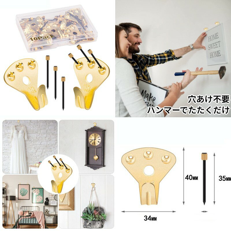 壁掛けフック ゴールド 10個入り 釘付き 耐荷重34kg 絵画 額縁 石膏ボード 吊り下げ 金具 ピクチャーハンガー[ゆうパケット発送、送料無料、代引不可]