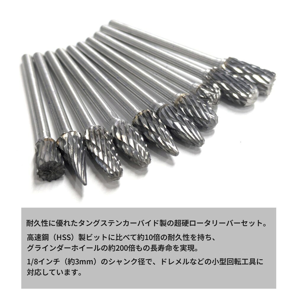 超硬バー 10本セット 商品説明 超硬ダイグラインダービットセット(ダブルカット) 高耐久・高精度の切削ツール 製品概要 本製品は、耐久性に優れたタングステンカーバイド製の超硬ロータリーバーセットです。1/8インチ(約3mm)のシャンク径で、ドレメルなどの小型回転工具に対応しています。 【ダブルカット設計】 ヘッド部分は交差する溝(ダブルカット)を採用しており、木材、プラスチック、アルミなど、比較的やわらかい素材の切削や彫刻に適しています。作業中の振動が少なく、仕上がりも滑らかです。 【幅広い互換性】 1/8インチのシャンクは、ドレメルをはじめとする多くの小型ロータリーツール(三爪チャック対応)に装着可能。DIY、木工、彫刻、研磨など幅広い用途に対応します。 【長寿命・高コストパフォーマンス】 本製品は、高速鋼(HSS)製ビットに比べて約10倍の耐久性を持ち、グラインダーホイールの約200倍もの長寿命を実現。安全かつ便利なプラスチック製収納ケース付きで、持ち運びや保管にも便利です。 ※輸入品の為、取扱説明書は付属しておりません。 ※一部の仕様やデザインは予告なく変更になる場合がございます。 商品仕様 入り数 10本 全長 43.5-50mm 切削径 1/4インチ(約6.35mm) シャンク長 35mm シャンク径 1/8インチ(約3mm) 素材 タングステンカーバイド 保証について ■メーカー保証なし 記載の注意事項を除く初期不良品の場合のみ、商品到着から1週間以内のみ対応いたします。 ご到着後はお早めに商品状態をご確認ください。 注意事項 ●こちらの商品は、新品です。 ●モニター環境により、実際のカラーと異なって見える場合がございます。 【ゆうパック優先配送の注意事項】(1) 締め切り時刻迄に決済が完了した注文が当日発送となります。(2) 店舗休業日のご注文は翌営業日の発送となります。(3) 商品名に「優先配送との同梱不可」の記載がある商品は優先配送商品との同梱はできません。(4) 商品名に「優先配送との同梱不可」の記載がされた商品が同梱されていた場合は、当日又は翌日発送されませんのでご注意下さい。(5) 同梱商品の中に「優先配送」の商品が1つ以上存在する場合は、配送方法に「定形外郵便」等、「優先配送」以外を選択した商品も「優先配送」で発送されます。※商品の発送は「ゆうパック優先配送」又は「ゆうパケット」を選択できます。★配送方法に「ゆうパケット」を選択した場合は運送便の都合上、化粧箱を外して簡易包装で発送する場合がございます。プレゼント用にご購入される場合はご注意願います。<ゆうパケットに関する注意事項> ・ ゆうパケットに関しては基本的にポストに投函する為、 配達時に何らかのトラブル等が有り、万一、購入された商品が配送事故・紛失・破損等によりお手元に届かない場合でも弊社は責任を負いかねますので予めご了承下さい。(配送中の事故等は、免責とさせて頂きます。) ・ ゆうパケットに関しては代金引換払い及び時間指定サービスはご利用頂けません。★配送方法に「ゆうパック優先配送」を選択した場合は送付先が北海道、沖縄、離島の場合は注文金額により以下の送料が必要です。・北海道の場合、注文金額が3,980円未満は880円、3,980円以上は送料無料です。・沖縄、離島の場合、注文金額が9,800円未満は880円、9,800円以上は送料無料です。
