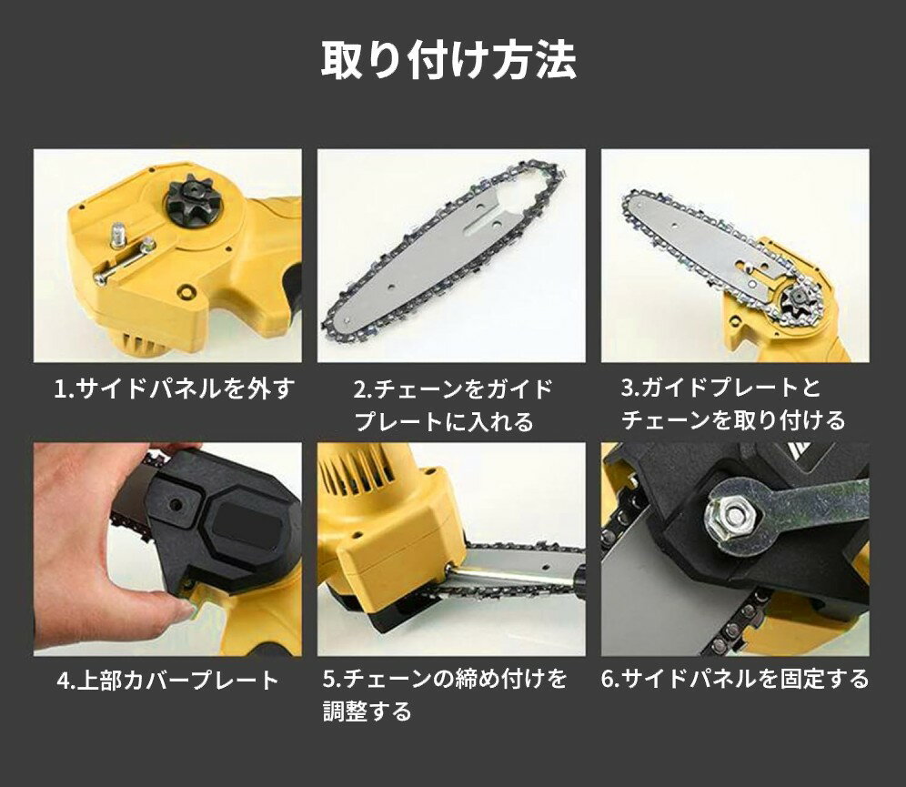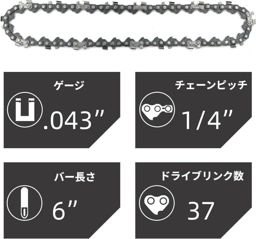 チェーンソー替え刃 6インチ 4本セット 商品説明 【6インチ チェーンソー替え刃 4本セット】6インチのミニ電動チェーンソーに対応した替え刃セット(4本入り)です。コードレス充電式タイプや木材カット用の6インチチェーンソーに対応。※ご購入前に、お使いのチェーンソーと互換性があるか必ずご確認ください。【高品質マンガン鋼を使用】高硬度のマンガン鋼を採用し、深い焼き入れ処理で優れた耐久性と耐摩耗性を実現。反動が少なく、スムーズかつスピーディな切断が可能です。剪定作業、竹・薪の切断、DIYなど幅広い用途に対応します。【簡単取り付け・交換】サイドカバーをナットドライバーで開け、古いチェーンを取り外して新しいチェーンに交換するだけ。取り付け方向を確認し、チェーンの張り具合をネジで調整してください。【高性能チェーンで快適な作業】先端が鋭く、耐摩耗性に優れたチェーン刃により、滑らかで効率的な切断が可能です。軽量かつ扱いやすく、木の枝や細材のカットに最適です。 ※輸入品の為、取扱説明書は付属しておりません。 ※一部の仕様やデザインは予告なく変更になる場合がございます。 商品仕様 セット数 4本セット チェーンピッチ 1/4インチ ゲージ .043"(1.1mm) バー長さ 6インチ(約15cm) ドライブリンク数 37 素材 マンガン鋼 保証について ■メーカー保証なし 記載の注意事項を除く初期不良品の場合のみ、商品到着から1週間以内のみ対応いたします。 ご到着後はお早めに商品状態をご確認ください。 注意事項 ●こちらの商品は、新品です。 ●モニター環境により、実際のカラーと異なって見える場合がございます。 【ゆうパック優先配送の注意事項】(1) 締め切り時刻迄に決済が完了した注文が当日発送となります。(2) 店舗休業日のご注文は翌営業日の発送となります。(3) 商品名に「優先配送との同梱不可」の記載がある商品は優先配送商品との同梱はできません。(4) 商品名に「優先配送との同梱不可」の記載がされた商品が同梱されていた場合は、当日又は翌日発送されませんのでご注意下さい。(5) 同梱商品の中に「優先配送」の商品が1つ以上存在する場合は、配送方法に「定形外郵便」等、「優先配送」以外を選択した商品も「優先配送」で発送されます。※商品の発送は「ゆうパック優先配送」又は「ゆうパケット」を選択できます。★配送方法に「ゆうパケット」を選択した場合は運送便の都合上、化粧箱を外して簡易包装で発送する場合がございます。プレゼント用にご購入される場合はご注意願います。<ゆうパケットに関する注意事項> ・ ゆうパケットに関しては基本的にポストに投函する為、 配達時に何らかのトラブル等が有り、万一、購入された商品が配送事故・紛失・破損等によりお手元に届かない場合でも弊社は責任を負いかねますので予めご了承下さい。(配送中の事故等は、免責とさせて頂きます。) ・ ゆうパケットに関しては代金引換払い及び時間指定サービスはご利用頂けません。★配送方法に「ゆうパック優先配送」を選択した場合は送付先が北海道、沖縄、離島の場合は注文金額により以下の送料が必要です。・北海道の場合、注文金額が3,980円未満は880円、3,980円以上は送料無料です。・沖縄、離島の場合、注文金額が9,800円未満は880円、9,800円以上は送料無料です。