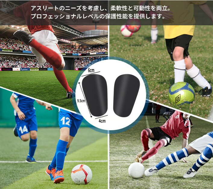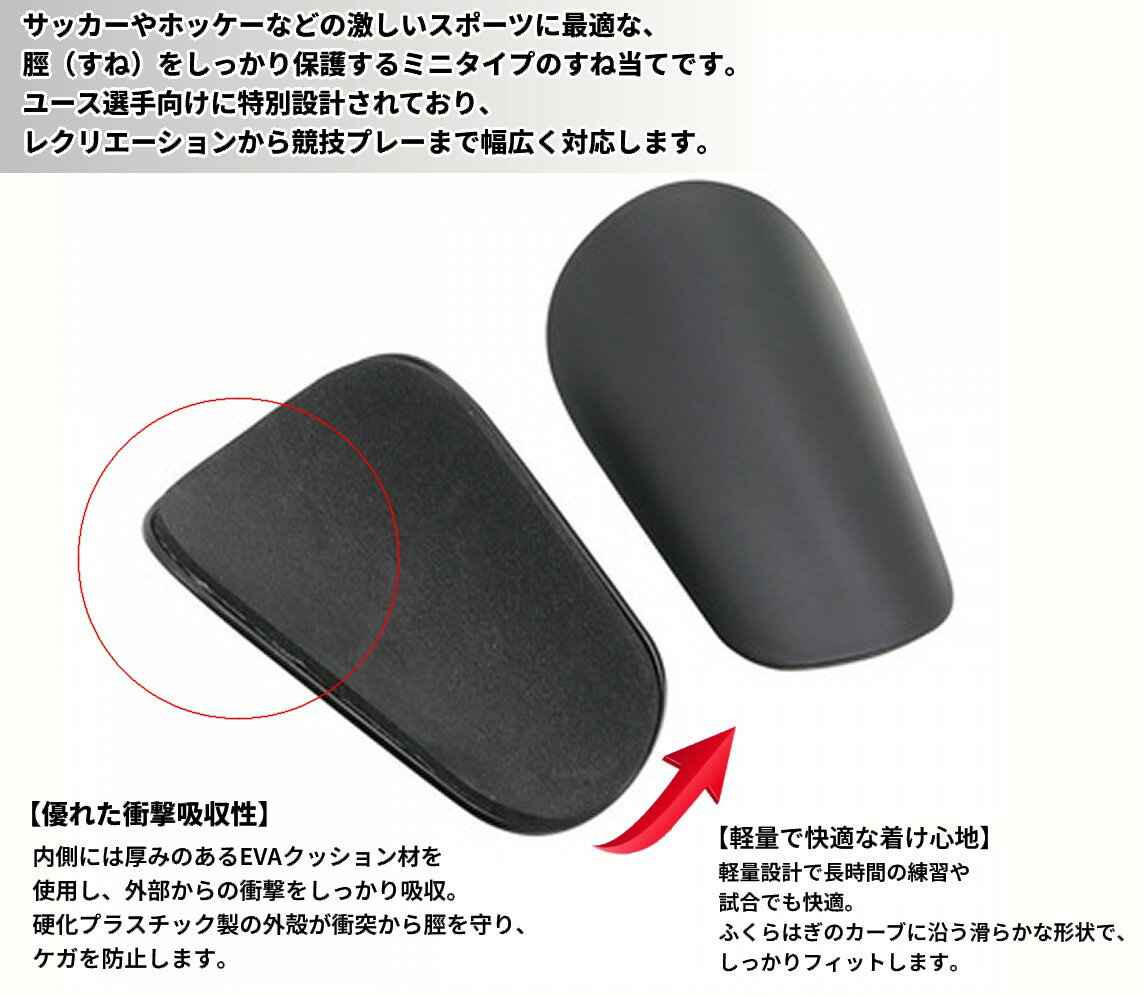 サッカー ミニレガース ブラック 商品説明 サッカーやホッケーなどの激しいスポーツに最適な、脛(すね)をしっかり保護するミニタイプのすね当てです。ユース選手向けに特別設計されており、レクリエーションから競技プレーまで幅広く対応します。 ●優れた衝撃吸収性 内側には厚みのあるEVAクッション材を使用し、外部からの衝撃をしっかり吸収。硬化プラスチック製の外殻が衝突から脛を守り、ケガを防止します。 ●軽量で快適な着け心地 軽量設計で長時間の練習や試合でも快適。ふくらはぎのカーブに沿う滑らかな形状で、しっかりフィットします。 ●優れた通気性 高品質な通気性素材を採用し、蒸れにくく、運動中も快適さをキープします。 ●プロ仕様の設計 アスリートのニーズを考慮し、柔軟性と可動性を両立。プロフェッショナルレベルの保護性能を提供します。 ※輸入品の為、取扱説明書は付属しておりません。 ※一部の仕様やデザインは予告なく変更になる場合がございます。 商品仕様 セット数 左右セット サイズ 長さ9.5cm×上幅6cm×下幅4cm 重量 11g(※1個あたり) 素材 PP、EVA 保証について ■メーカー保証なし 記載の注意事項を除く初期不良品の場合のみ、商品到着から1週間以内のみ対応いたします。 ご到着後はお早めに商品状態をご確認ください。 注意事項 ●こちらの商品は、新品です。 ●モニター環境により、実際のカラーと異なって見える場合がございます。 【ゆうパック優先配送の注意事項】(1) 締め切り時刻迄に決済が完了した注文が当日発送となります。(2) 店舗休業日のご注文は翌営業日の発送となります。(3) 商品名に「優先配送との同梱不可」の記載がある商品は優先配送商品との同梱はできません。(4) 商品名に「優先配送との同梱不可」の記載がされた商品が同梱されていた場合は、当日又は翌日発送されませんのでご注意下さい。(5) 同梱商品の中に「優先配送」の商品が1つ以上存在する場合は、配送方法に「定形外郵便」等、「優先配送」以外を選択した商品も「優先配送」で発送されます。※商品の発送は「ゆうパック優先配送」又は「定形外郵便」を選択できます。★配送方法に「定形外郵便」を選択した場合は運送便の都合上、化粧箱を外して簡易包装で発送する場合がございます。プレゼント用にご購入される場合はご注意願います。<定形外郵便に関する注意事項> ・ 定形外郵便に関しては基本的にポストに投函する為、 配達時に何らかのトラブル等が有り、万一、購入された商品が配送事故・紛失・破損等によりお手元に届かない場合でも弊社は責任を負いかねますので予めご了承下さい。(配送中の事故等は、免責とさせて頂きます。) ・ 定形外郵便に関しては代金引換払い及び時間指定サービスはご利用頂けません。 ・ 通常便と比べると到着までに時間がかかります。 ・ 伝票番号による荷物の追跡を行うことはできません。★配送方法に「ゆうパック優先配送」を選択した場合は送付先が北海道、沖縄、離島の場合は注文金額により以下の送料が必要です。・北海道の場合、注文金額が3,980円未満は880円、3,980円以上は送料無料です。・沖縄、離島の場合、注文金額が9,800円未満は880円、9,800円以上は送料無料です。