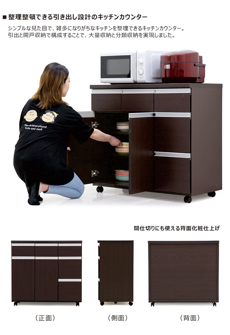【BLACK FRIDAY期間中全品ポイント5倍】食器棚 ロータイプ 引き出し 幅90cm キッチンカウンター 間仕切り キャスター付き キッチンワゴン キッチン 収納 棚収納 ストッカー 作業台 白 ホワイト ブラウン レンジ台 日本製 大川家具 完成品 一人暮らし おしゃれ 北欧 シンプル