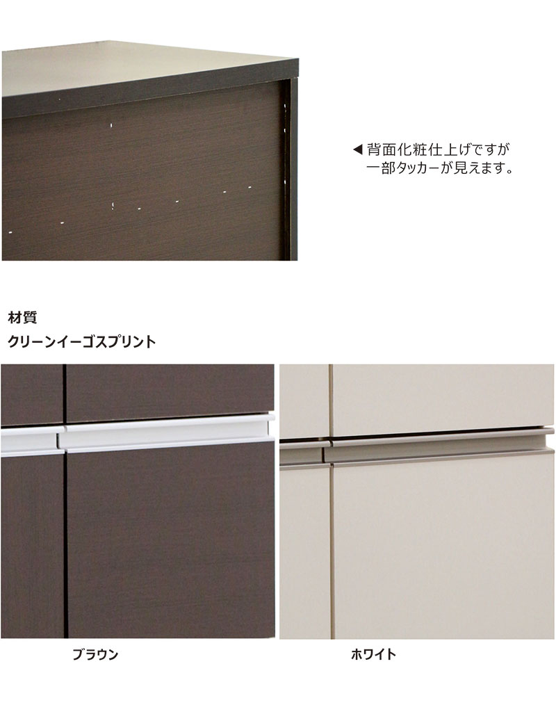 商品情報 材質 クリーンイーゴストプリント ※背面化粧仕上げですが、一部タッカーが見えます。 サイズ ■本体:幅88.5×奥行44.5×高さ81.8cm ■小引き出し 幅21.5×奥行32.5×深さ10(有効12.5)cm ■深引き出し 幅21.5×奥行32.5×深さ14(有効24)cm ■扉収納(可動棚2枚付属・6段・3cmピッチ) 幅55.5×奥行29×高さ53.5cm カラー ホワイト・ブラウン色 特徴 完成品(キャスター・棚板のみお客様取り付け) 引き出し全段:スライドレール採用 キャスター高さ:約4.6cm 配送方法玄関、軒先渡し 配送員が一人の場合、荷受け人様に荷降ろしの お手伝いをお願いする場合がございます。 ※開梱・設置、組み立ては有料のサービスになりますので、 お見積りご希望の方は事前にお問い合わせくださいませ。 時間指定不可 家具の配送のため時間の指定はできません。 前日もしくは当日に配送業者よりおおよその配送時間を ショートメールまたは電話にてご案内いたします。 そのため、できるだけ携帯番号での登録をお願いします。 別途送料東北・北海道 ※沖縄・離島は別途送料お見積もり 全国送料無料 (但し北海道・東北地方は別途送料が必要です) 別途 東北地方:¥3,000 北海道:¥4,000 別途送料はご注文確認後に加算した金額に訂正させていただきます。 ■北海道と東北地方へのお届けには、10日以上お時間を頂く場合もございます。 ■発送後のお客様都合のキャンセル(玄関やお部屋に搬入出来ない場合・カラーや商品内容変更など)やお届け先変更につきましては別途 転送料・送料がかかります。 ■販売しております商品につきましては、複数の店舗で販売を行っております為、ご注文のタイミングによりましては欠品・完売となる場合がございます。上記による保証(値引きやポイントの付与等)は出来かねます事を予めご了承ください。 メーカー希望小売価格はメーカーカタログに基づいて掲載しています☆☆サイズ違い商品一覧☆☆Related products 幅60cmカウンター キャスター付き キッチン収納 幅120cmカウンター キャスター付き キッチン収納