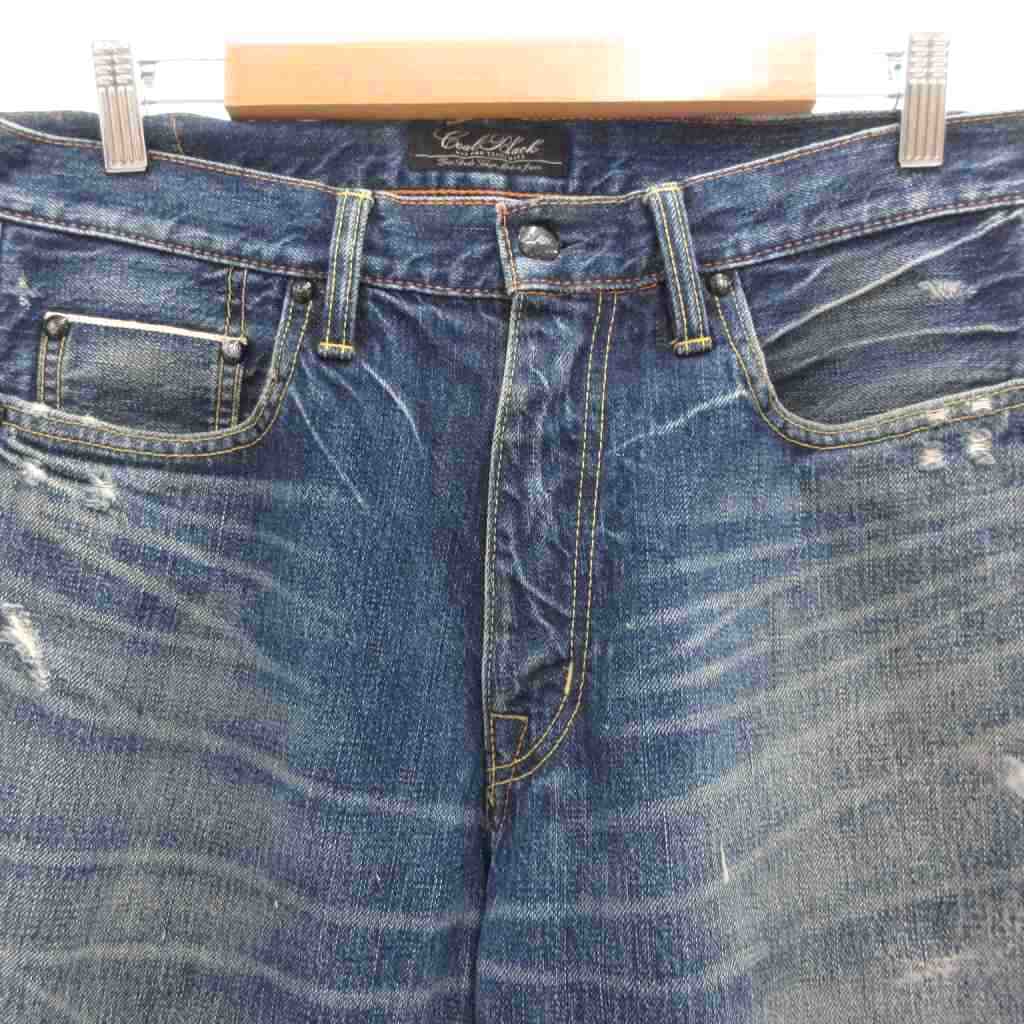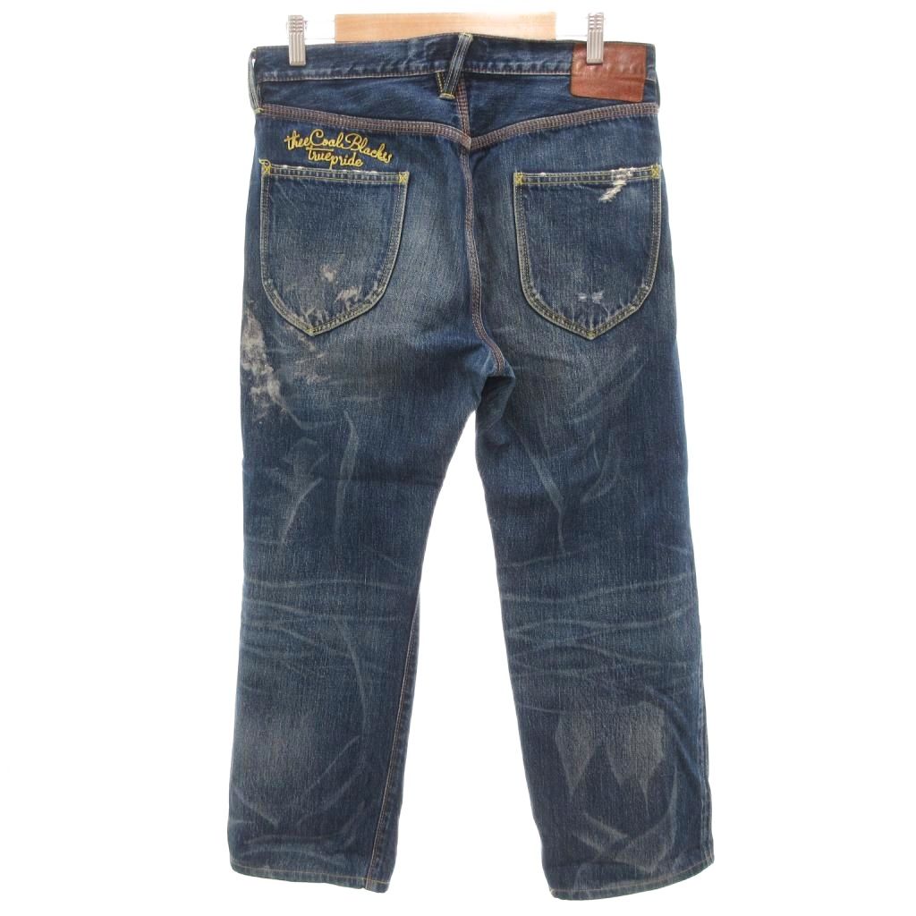 【中古】コールブラック Coal Black デニムパンツ ジーンズ ストレート ジップフライ セルビッチ ダメージ加工 ペイント加工 M インディゴブルー/GV ■GY18 メンズ 【ベクトル 古着】 250821