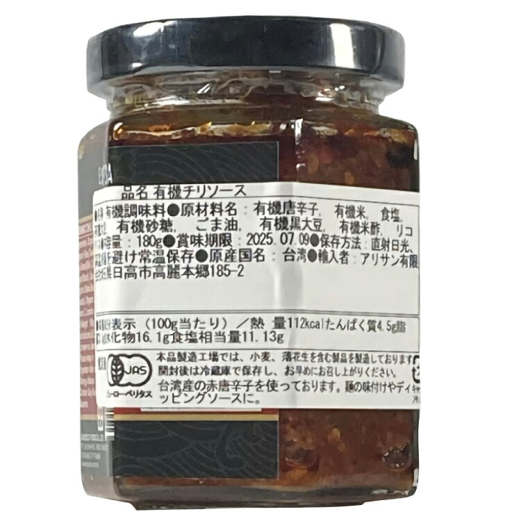 台湾産の赤唐辛子を使っております。麺の味付けやディッピングソースに。 原材料:有機唐辛子, 有機米, 食塩, 有機大豆, 有機砂糖, ごま油, 有機黒大豆, 有機米酢, リコリス 内容量:180g 数量:3個 販売者:アリサン