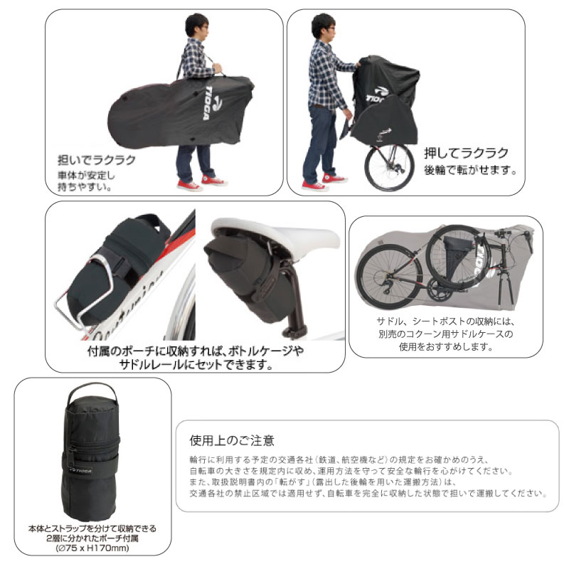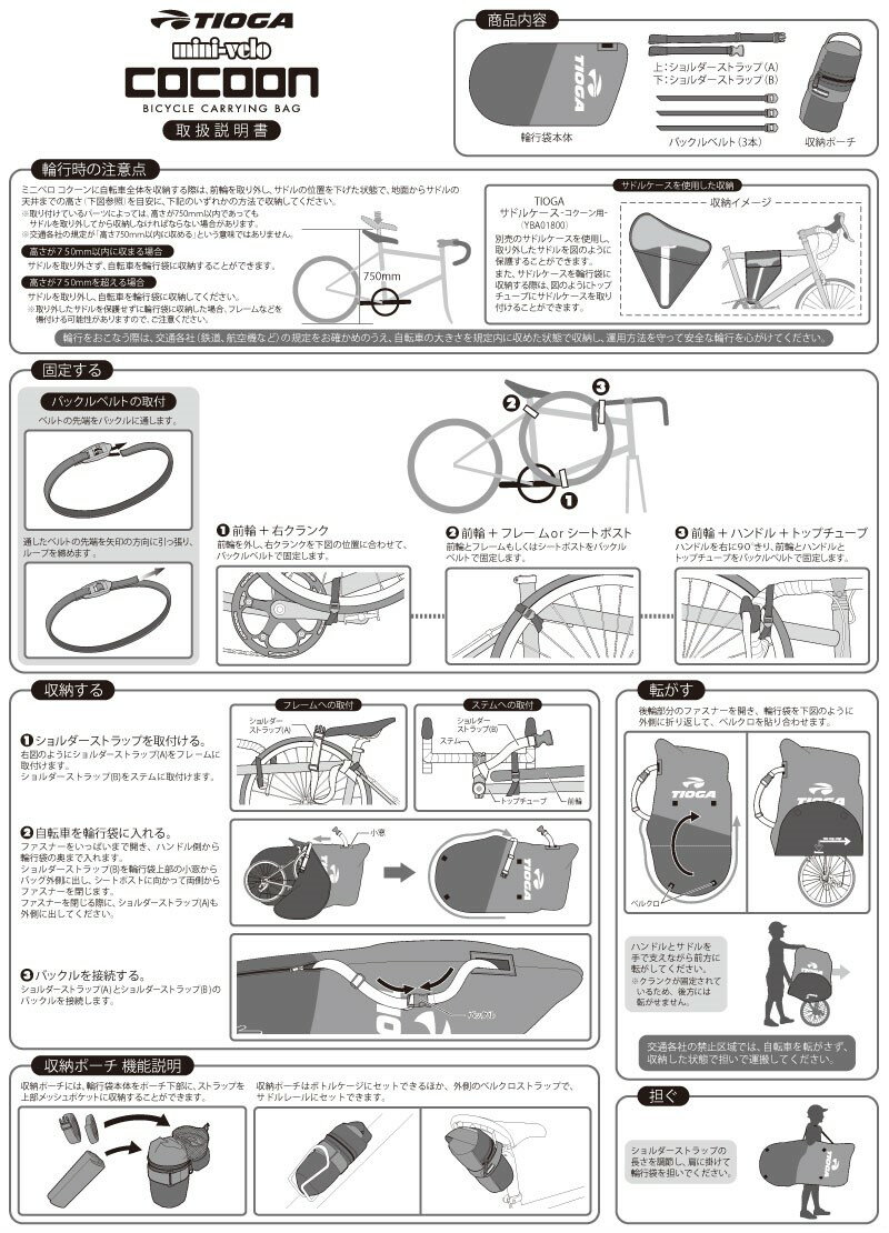 ■カラー:ブラック ■70 デニール ナイロン ■撥水加工 ■バックルベルト 3本付属 ■ショルダー ストラップ付属 ■収納ポーチ付属 ■L1,480 x H870mm ■約245g (付属品を含む) ※e バイクには使用しないでください。 ■CODE(MR):BAR03300 ■JAN:4935012032700 ※輪行をおこなう際は、交通各社 (鉄道、航空機など) の規定をお確かめのうえ、自転車の大きさを規定内に収めた状態で収納し、運用方法を守って安全な輪行を心がけてください。 ※交通各社の禁止区域では、自転車を転がさず、収納した状態で担いで運搬してください。 ※商品のスペック・パッケージ・デザインは予告なく変更される場合がございます。 予めご了承ください。TIOGA Minivelo Cocoon 70 デニール ナイロンを採用した軽量、コンパクトなミニベロ用「ミニベロ コクーン」。 本体とストラップを分けて収納できるよう、2層に分かれたポーチが付属しています。