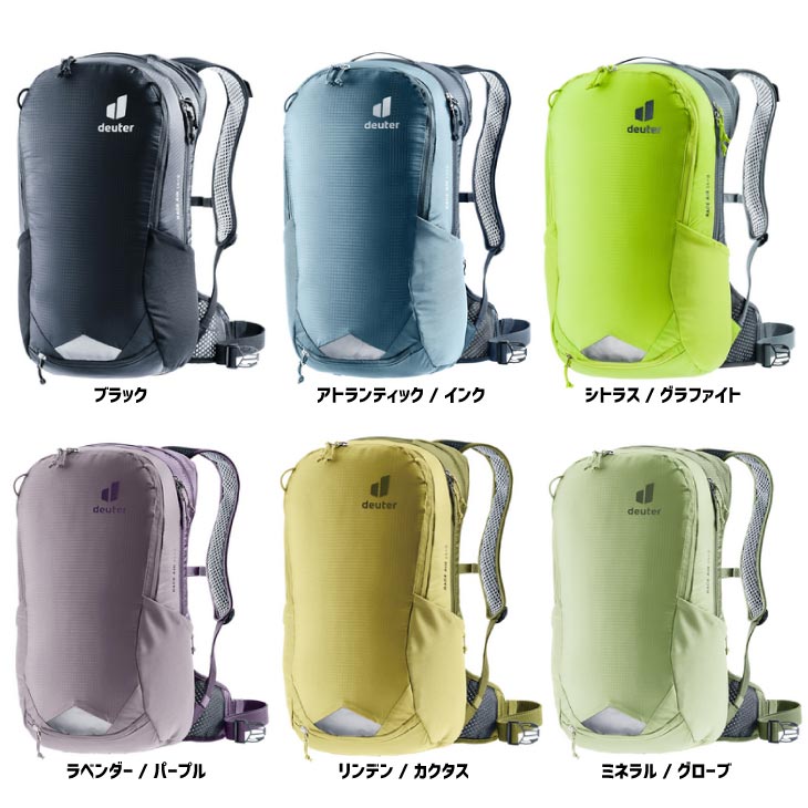 ■カラー: ブラック アトランティック/インク シトラス/グラファイト ラベンダー/パープル リンデン/カクタス ミネラル/グローブ ■容量:14+3L ■参考重量:約940g ■サイズ:H46×W25×D18cm ■素材: 100D リサイクルナイロン ・エアコンフォートシステム ・エクスパンダブル ・レインカバー ・ヘルメットホルダー ・サングラスホルダー ・スマートフォンポケット ■JAN: 【4046051149387】ブラック 【4046051149394】アトランティック/インク 【4046051149424】シトラス/グラファイト 【4046051159775】ラベンダー/パープル 【4046051159782】リンデン/カクタス 【4046051172453】ミネラル/グローブ ※商品のスペック・パッケージ・デザインは予告なく変更される場合がございます。 予めご了承ください。deuter RACE AIR 新しい背面システムを採用したことでドイター製品の中で最も背面通気性に優れた100%リサイクル素材のツーリング用モデルです。 背面側のファスナーを開けることで、3L分の容量を拡張することが可能です。