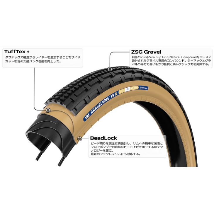 【700×30C】 ■ETRTO:30-622 ■重量:約370g ■推奨内圧(kPa):TLR…MAX400、TUBED…MAX650 ■品番:【F730-GKSK-P-D2】 ■JAN:【4931253033087】 ------------------------------------ 【700×35C】 ■ETRTO:35-622 ■重量:約450g ■推奨内圧(kPa):TLR…MAX400、TUBED…MAX525 ■品番:【F735-GKSK-P-D2】 ■JAN:【4931253033094】 ------------------------------------ 【700×40C】 ■ETRTO:40-622 ■重量:約510g ■推奨内圧(kPa):TLR…MAX400、TUBED…MAX525 ■品番:【F740-GKSK-P-D2】 ■JAN:【4931253033100】 ------------------------------------ 【700×45C】 ■ETRTO:45-622 ■重量:約600g ■推奨内圧(kPa):MAX400 ■品番:【F745-GKSK-P-D2】 ■JAN:【4931253033117】 ------------------------------------ 【700×50C】 ■ETRTO:50-622 ■推奨内圧(kPa):MAX350 ■品番:【F750-GKSK-P-D2】 ■JAN:【4931253033124】 ------------------------------------ 【26×2.10】 ■ETRTO:54-559 ■推奨内圧(kPa):MAX350 ■品番:【F2621-GKSK-P-D2】 ■JAN:【4931253033131】 ------------------------------------ 【29×2.10】 ■ETRTO:54-622 ■推奨内圧(kPa):MAX350 ■品番:【F2921-GKSK-P-D2】 ■JAN:【4931253033148】 ------------------------------------ ■カラー:ブラック/ブラウン トレッド…ブラック サイド …ブラウン ■ビード:フォールディング ※商品のスペック・パッケージ・デザインは予告なく変更される場合がございます。 予めご了承ください。Panaracer GRAVELKING SK + TLR 『GravelKing SK』最強バージョン グラベル走行時の走破性を高めるブロックパターンを採用。 過酷なコンディションに耐えられるように「TuffTex+」を採用し 耐パンク性能をさらに高めた『グラベルキング SK』最強バージョン。