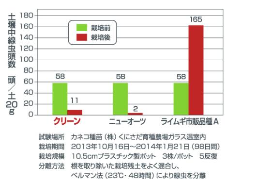 飼料・緑肥兼用品種 [特徴] 極早生種です。 春先の出穂が早く、後作の準備・播種を余裕を持って行えます。 キタネグサレセンチュウの密度低減効果があり、輪作・休閑緑肥として有効です。 耐寒性、耐雪性に優れた極早生種です。 一部地域において問題となっている黒斑細菌病(P.cannabina pv.alisalensis)に罹患せず、アブラナ科野菜の輪作・休閑緑肥として安心して利用できます。 [播種量] 6~8kg/10a [「クリーン」によるキタネグサレセンチュウ抑制効果] ●「クリーン」を作付けすることにより土壌中の線虫密度が低下することを確認しました。 ●また、栽培後の根内線虫頭数もアウェナ ストリゴサ「ニューオーツ」同様明らかに少なく、ライムギ市販品種Aよりも線虫の増殖性が低いことを確認しました。 [種子商品と責任] ※種子は発芽試験の基準を満たしたものをお届けいたしますが、商品の性質上、すべて同一ではなく異株が出ることがございます。 ※播種後の条件が商品にとって不適切な場合、発芽しないことがございます。品目ごとに適した条件下での管理をお願いいたします。 ※種子はご注文いただいた時点で有効期限内のものを発送させていただきますが、種子はナマモノとなりますので、予め作型をご自身でお決めいただいてからのご購入を推奨いたします。 ※独自に加工した種子を使用した場合、自家採種(採り返し)した種子を使用した場合、お届け後に種子の有効期限が切れたものを播いた場合の責任は負いかねます。 ※種子は保管状況、天候、栽培環境など様々な条件により結果が異なるため、種子の生長後や収穫物に対する補償は行っておりません。 ※植物は品種の特性や環境によって生育差が生じることがあるため、記載の収穫量、サイズ、味などの表現に関しては異なる場合がございます。