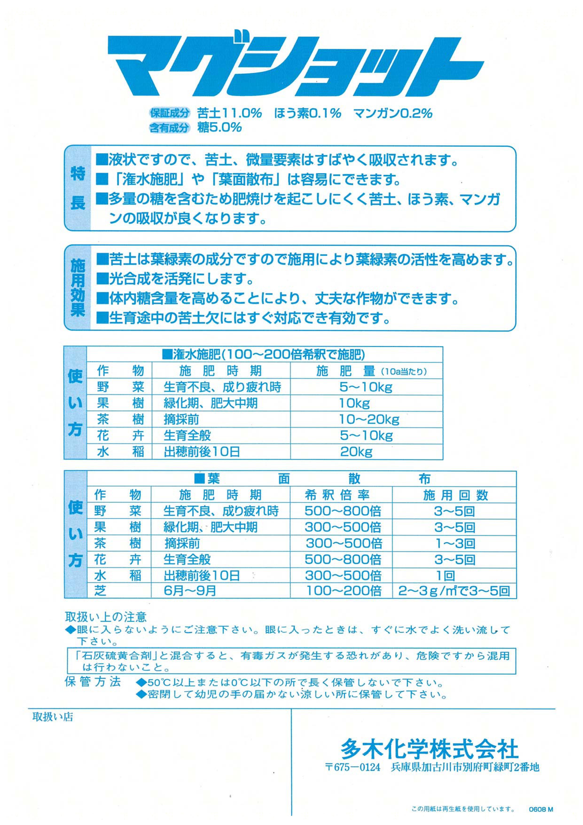 野菜や果樹の苦土欠に!散布してすぐに効果が出ます! マグショットの特徴 ●液肥なので、苦土、微量要素を素早く吸収します。 ●多量の糖を含むため、肥焼けを起こしにくく苦土、ホウ素、マンガンの吸収が良くなります。 ●苦土は葉緑素の成分ですので、施用により葉緑素の活性を高めます。 ●体内糖含量を高めることで、丈夫な作物ができます。 【使用量】 《葉面散布》 野菜・花卉:500倍~800倍 果樹・茶樹:300倍~500倍 水稲:300倍~500倍(出穂前後10日) 《灌水施肥》(10a当り) 野菜・花卉:5kg~10kg 果樹:10kg 茶樹:10kg~20kg 水稲:20kg(出穂前後10日) 【保証成分】 苦土:11% ホウ素:0.1% マンガン:0.2%