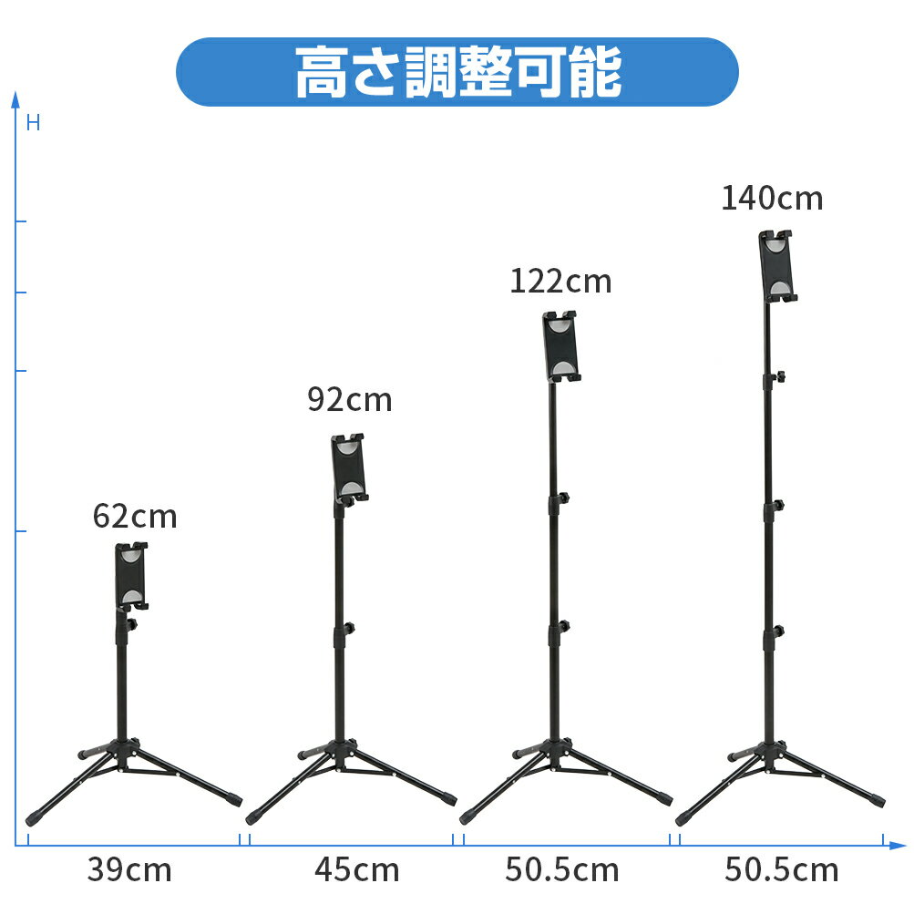 商品詳細 規格 商品名:タブレットスタンド 三脚 材質:ABS樹脂、シリコンゴム、スチール 色:ブラック 高さ:62cm~140cm ホルダーの幅(内寸):13.5cm~22.5cm 梱包サイズ:約幅40cmx奥行12cmx高さ10cm 製品重量:約1.2kg 特徴 【対応サイズ】4.5~12.9インチのタブレット・スマホに使います。(ipad proやipadミニに対応します) 【高さ調整可能】調整範囲:62cm~140cm。3段式のパイプは可変できる箇所が複数あるので、高さが自由に調整できます。 【角度調節可能】ホルダー部分は360回転可能なので、縦置きも横置きもできます。使い勝手がとてもよいです。 【高い安定性】底部が広くて、重さもあるので、ゆれがなくて安定感は抜群です。 【幅広く活用できます】ネット配信・撮影・動画視聴・ネット閲覧・勉強・楽器練習などにオススメです。在宅勤務/テレワークでも大活躍しています。 注意事項 ・当店でご購入された商品は、国内の提携先倉庫から配送されます。 ・国内配送の商品は国内でのお買い物と同じく消費税が発生いたします。 ・お客様がご利用のモニターの設定及び特性により、実際の商品とは色味が異なる場合がございます。 ・【安心な品質】商品について何か質問や問題があれば、いつでも、遠慮なくご連絡ください。