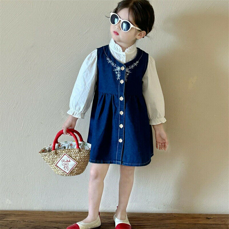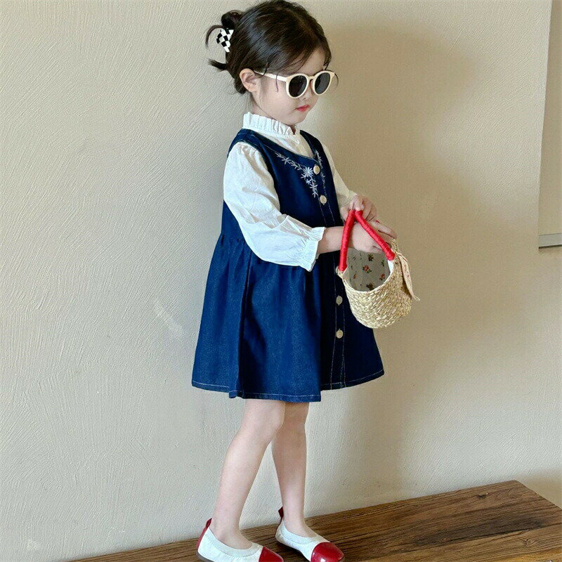 子供服 春 秋 女の子 キッズ セットアップ 長袖 シャツ ジャンパースカート デニム ワンピース ガールズ セット サロペットスカート こども服 白ブラウス 2点セット 可愛い 韓国風 通園 通学 入学式 卒業式 結婚式 発表会 七五三 洋服 重ね着 普段着