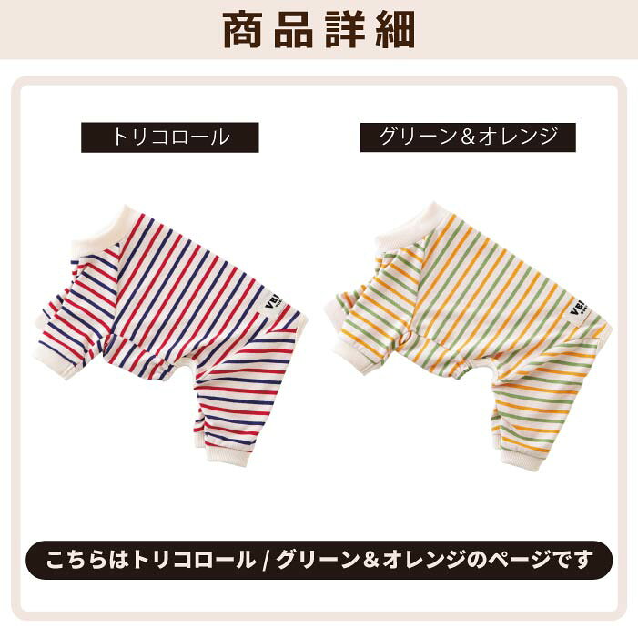 犬服 VERY BORDERS CLUB コットン95% ロンパース 吸湿性・寒暖差対策 トリコロール・グリーン×オレンジ [全30サイズ] 小型犬 中型犬 大型犬 超大型犬 ダックス 胴長 やわらかい 肌にやさしい 綿 長袖 ボーダー 着せやすい 動きやすい ルームウェア