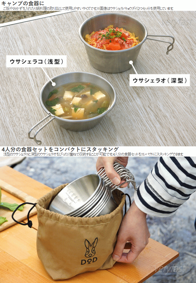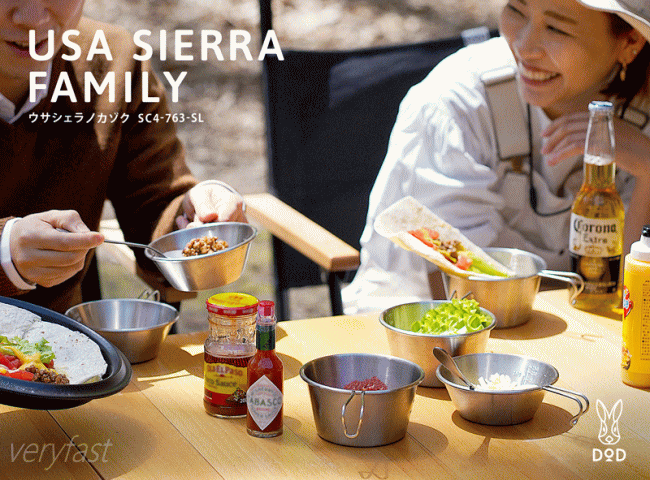 商品画像は実際のカラー・デザインが異なって見える場合があります。またメーカーにてお断り無く仕様を変更する場合等がございます。 商品形状により他商品との同梱発送ができない場合がございます。 ※ご注文日時や内容によっては購入履歴からのキャンセル及び修正を受け付けることができない場合がございます。 ※一部の商品でWEBページとロゴデザインが異なっている場合がございますが、予めご了承いただけますようお願い申し上げます。ファミリーキャンプ用のシェラカップセット。浅型サイズ×4、深型サイズ×4をコンパクトに持ち運べます。 DODのロゴが入ったファミリーキャンプ用シェラカップセット。浅型サイズ×4、深型サイズ×4、それらをまとめて運べるキャリーバッグのセットです。それぞれがぴったり重なる独自設計で持ち運びしやすく工夫しました。 カラー シルバー サイズ ウサシェラコ(浅型):約W17.5×D12.5×H4.5cmウサシェラオ(深型):約W17.5×D12.5×H6.5cm 総重量 約955g 材質 ステンレス鋼(本体:ステンレス304、持ち手:ステンレス201) 容量 ウサシェラコ(浅型):満水容量350mlウサシェラオ(深型):満水容量530ml セット内容 ウサシェラコ(浅型)×4、ウサシェラオ(深型)×4、キャリーバッグ×1 JAN CODE 4589946146813 商品管理ID bs-1428 ※製品等の色はご使用になるモニターや、設定によって若干の違いが発生する場合があります。 ※製品改良のため予告なくデザイン・仕様を変更する場合があります。 ※サイズ・重量などの数値には若干の個体差があります。 ※掲載写真はできる限り実物の色味に近づく様に加工・調整しておりますがお客様がお使いのモ ニターの設定や天候・照明の当たり具合等により実物の色味と異なって見える事がございます。 ※火にかけると変色する場合がございます。予めご了承下さい。 ※内側から強い力をかけると外側に底面がふくらむ場合があります。この場合、安定性を損ない ますので内側に底面を押し込んで安定した状態でご使用下さい。 ※ご注文のお客様へのお知らせ※ 商品形状により他商品との同梱発送ができない場合がございます。