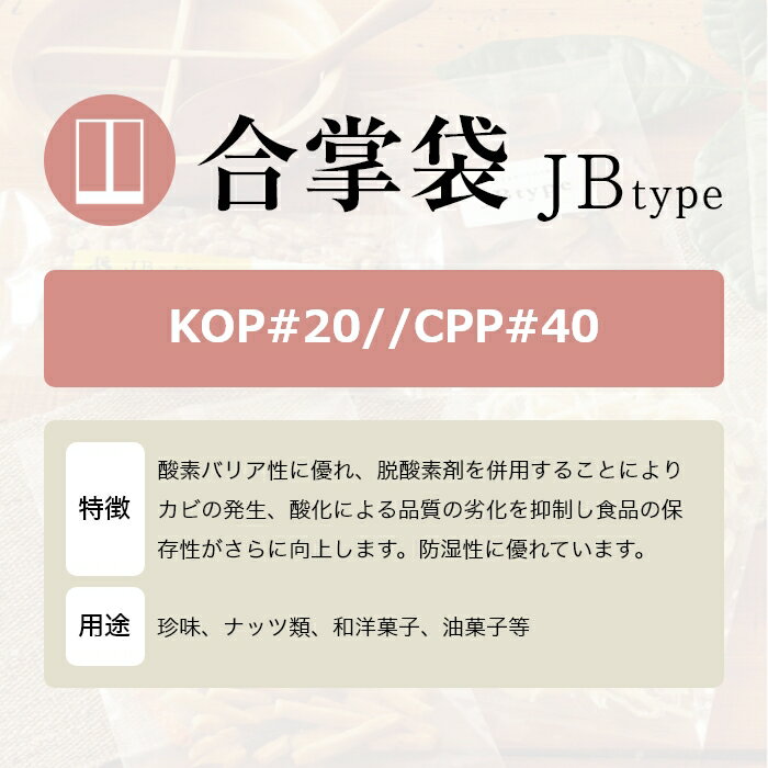 ガスバリア性があり、脱酸素剤包装に使用して効果を発揮します。 ※使用上のご注意 ・重量物の包装には適しておりません。 ・水分や油分を多く含むものにはご使用できません。 ・冬場、寒冷地など低温下での使用にはご注意ください。低温下ではシール強度が弱くなります。 ・脱酸素剤は使用できません。(乾燥剤は使用可能) 形状 合掌袋 商品名 JBJ-1 KOP#20//CPP#40 合掌袋 100 × 180 サイズ 幅100mm×高さ180mm 素材 OPP//CPP 枚数 100 重量(g) 2.3 ※モニター発色の具合により、実物とは色合いが異なる場合がございます。